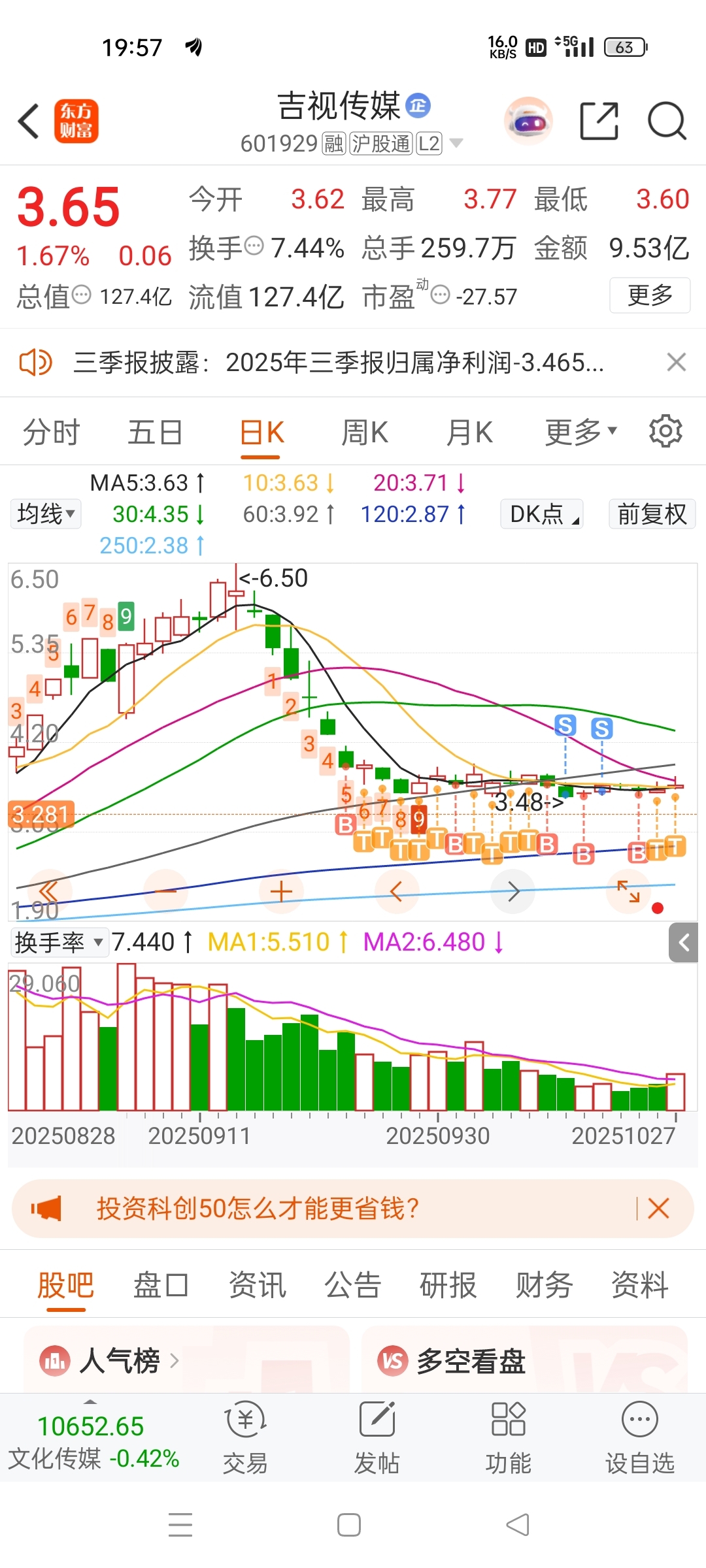 $吉视传媒(SH601929)$ 主打一个不放弃,目标价先要维持4元不变,防守位3.50,第一次探底3.66,第二次3.50,笫三次3.48,可以把3.48做为底部进行高抛低吸,也可以做为防守位。虽然有点艰难,但是千万别放弃,放弃就已经没信心了。