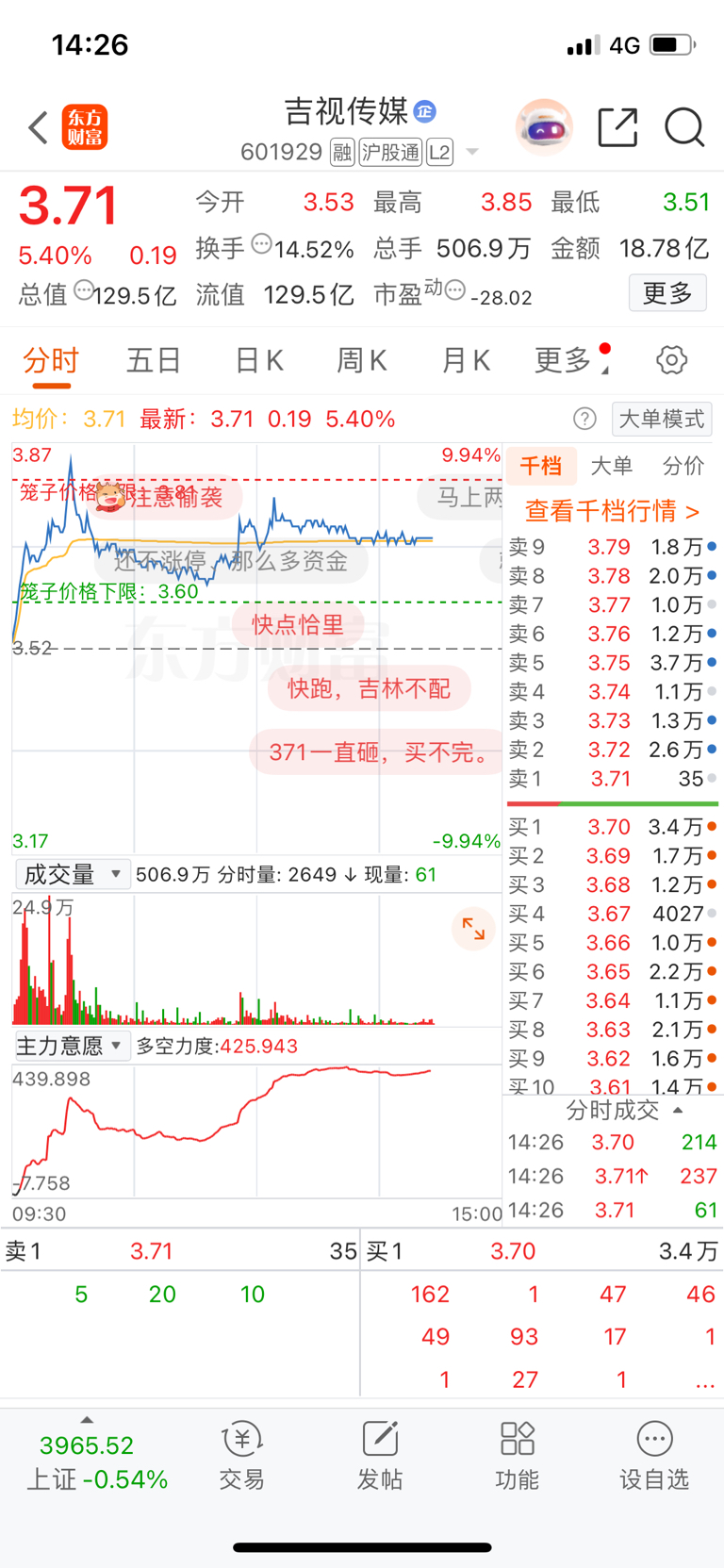 $吉视传媒(SH601929)$ 3.71这个位置横了一个下午了,什么情况?这位置出货的话,感觉主力没多少利润啊