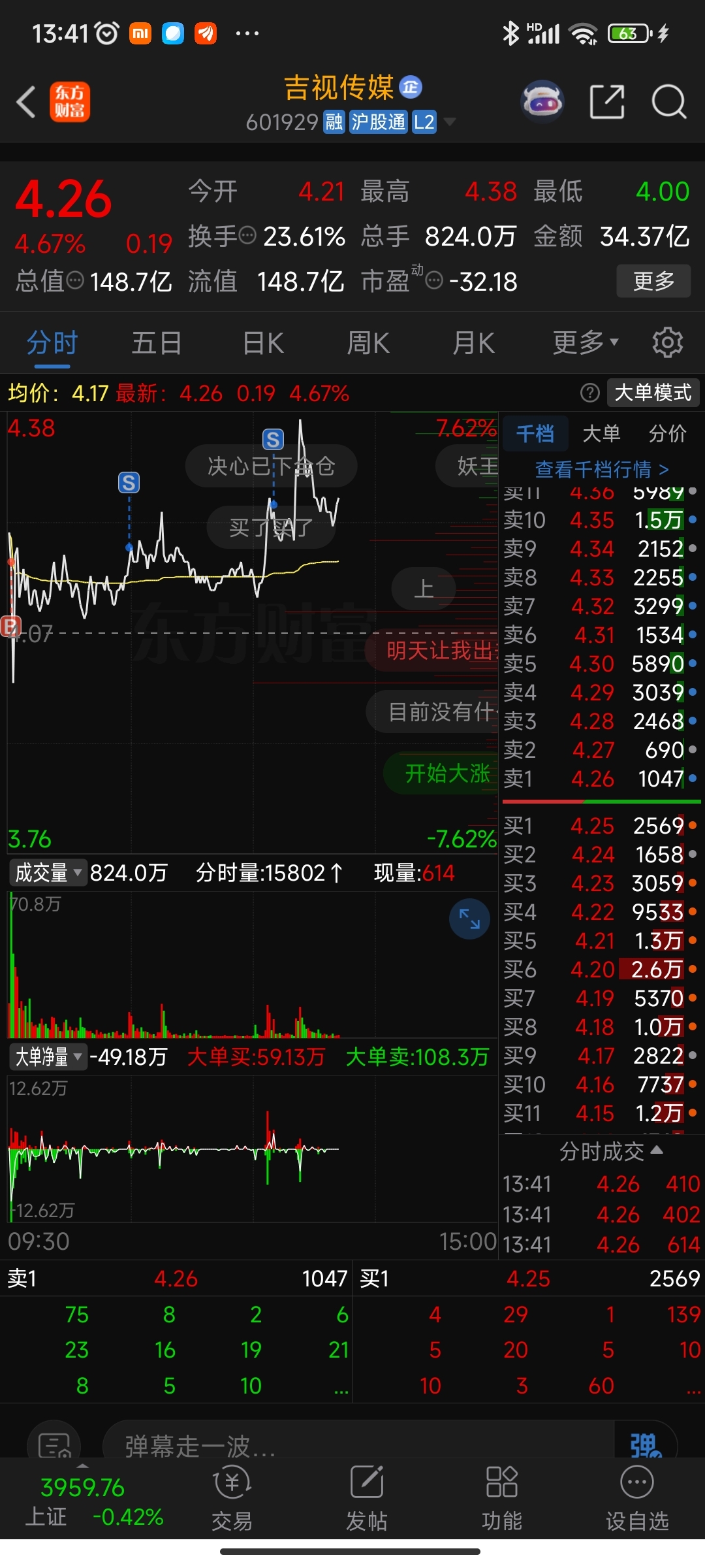 $吉视传媒(SH601929)$ 还亏20点,不过怕明天下来先走点