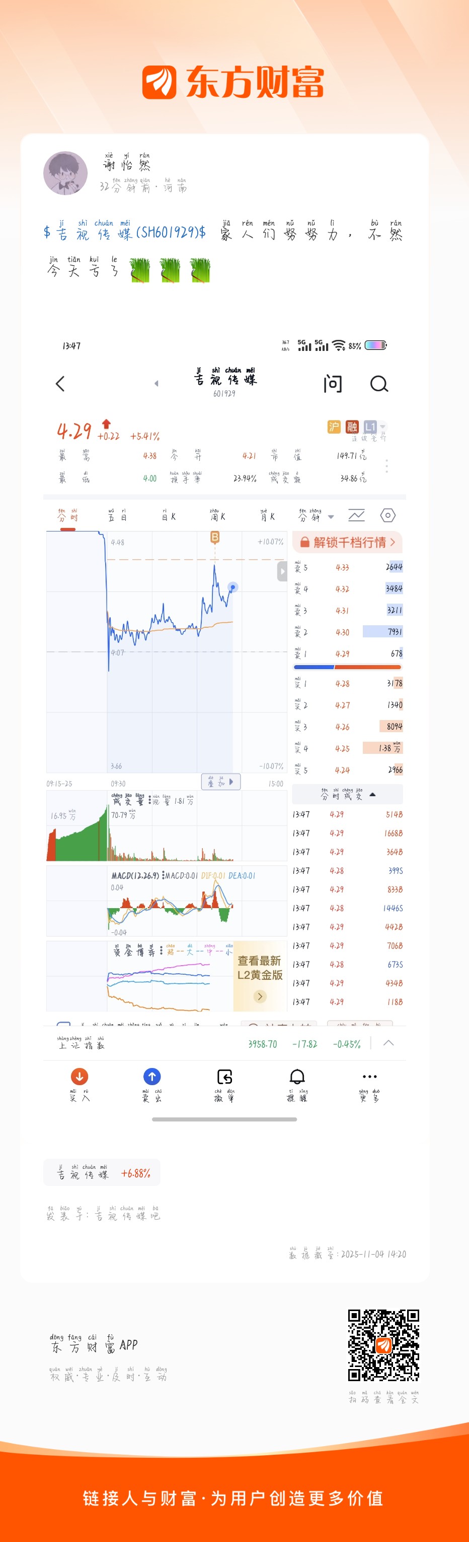 $吉视传媒(SH601929)$  家人们努努力,不然今天亏了