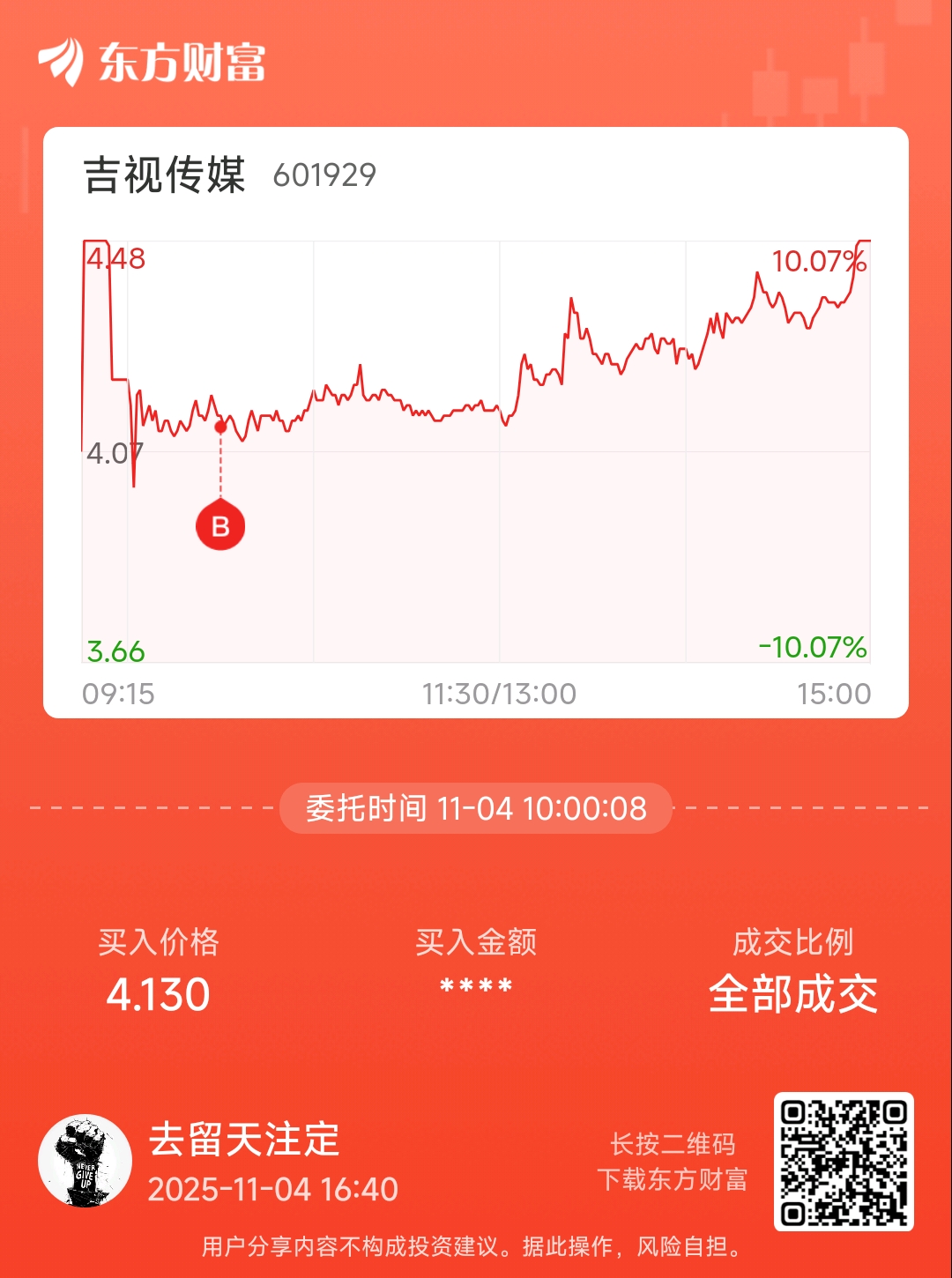 $吉视传媒(SH601929)$ 已经瑟瑟发抖了今天99.999999%都是这个点上车的,所以明天不会轻易上攻也就代表明天不会板,反倒会来个跌停,反正持有过明天再冲板的概率小之又小,甚至不会
