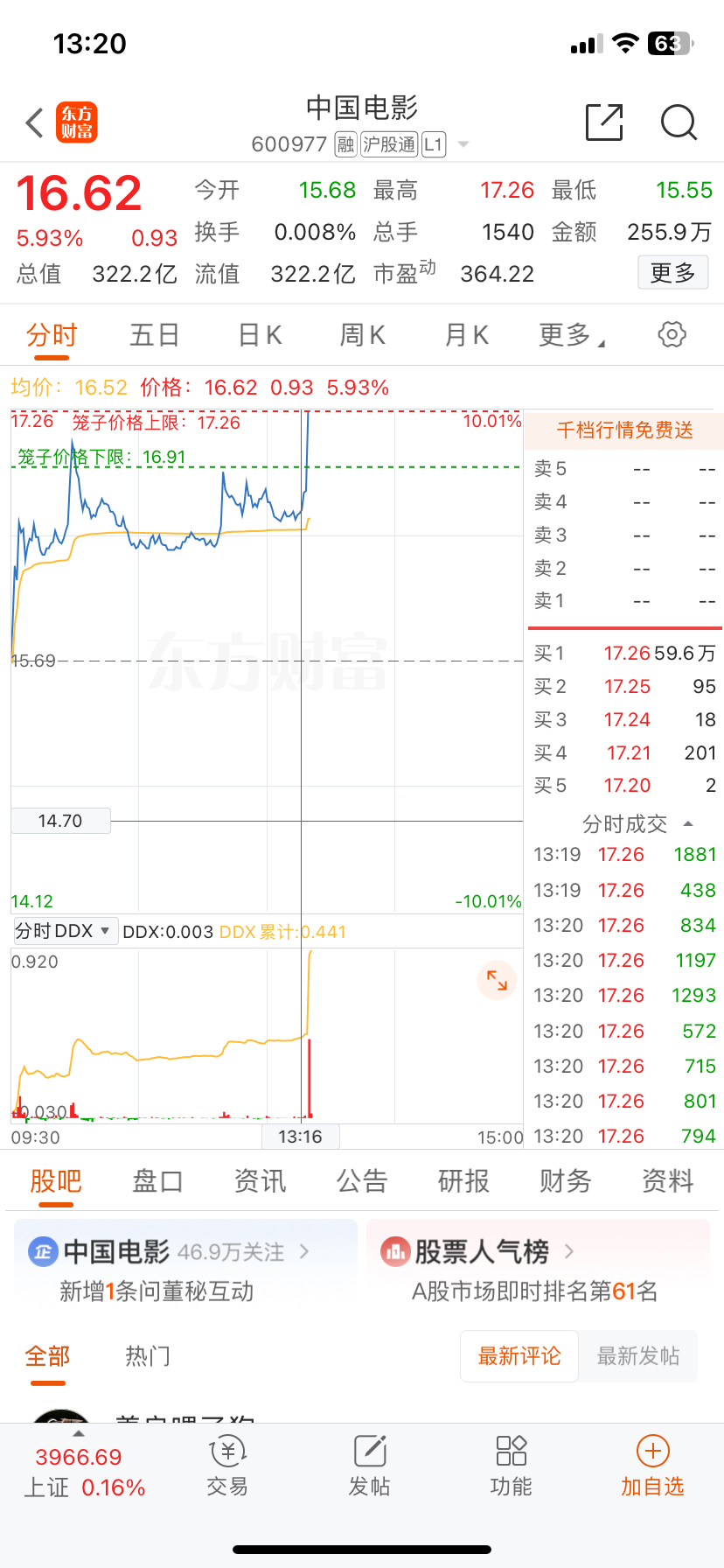 无语了刚刚6个点本想果断卖了你、6个点进中国电影的、结果中国电影却秒拉涨停封板