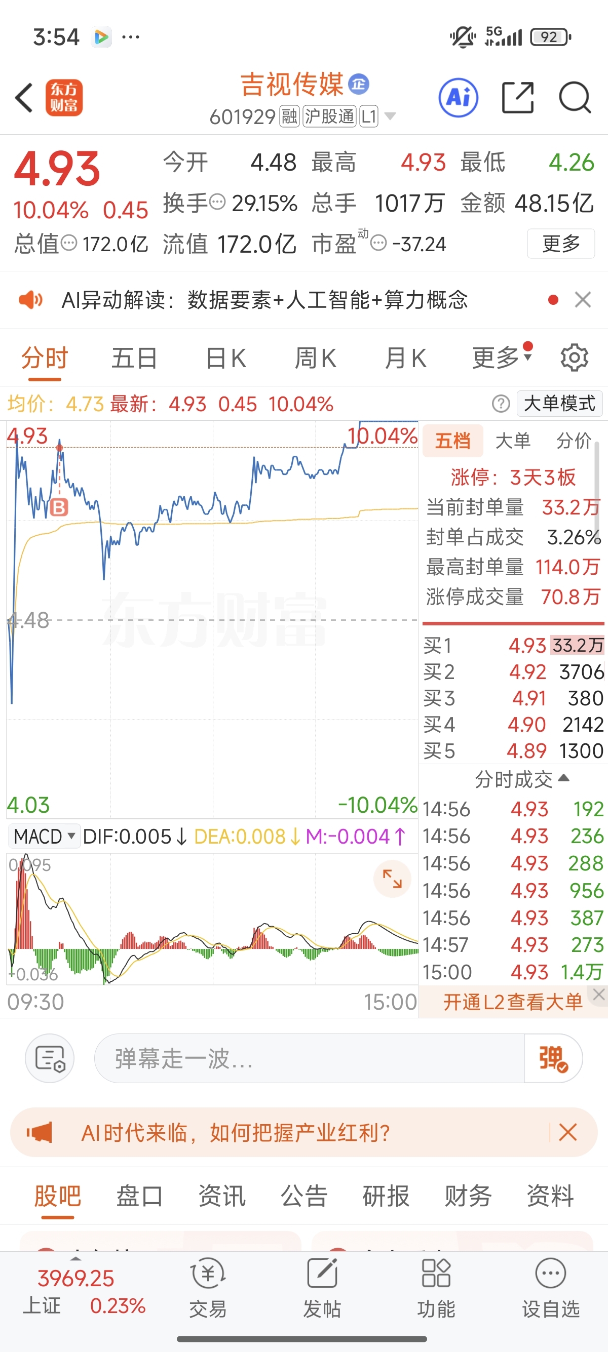 $吉视传媒(SH601929)$ 今天买的位置很高,明天能连板吗?