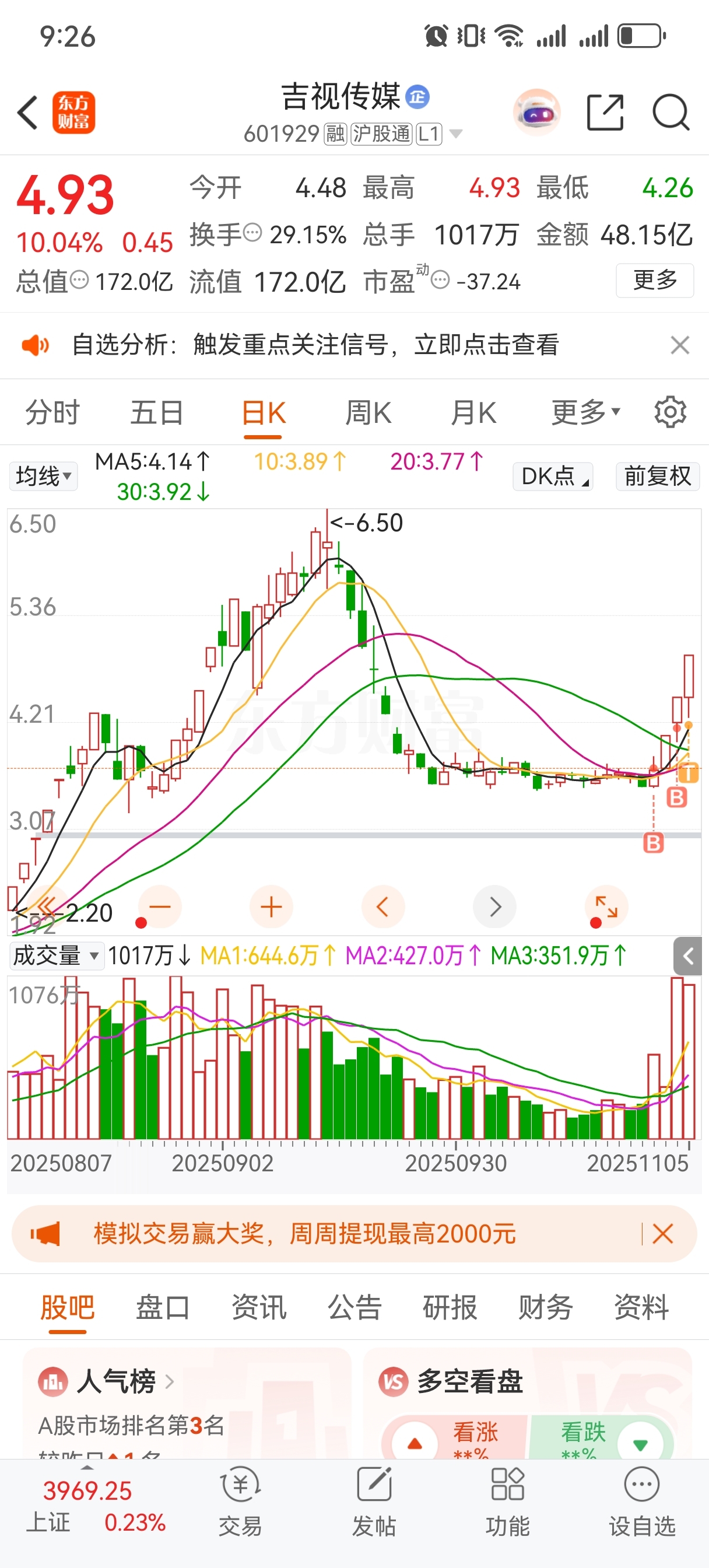 $吉视传媒(SH601929)$ 感觉要下蹲一下了,明天找机会踢一脚