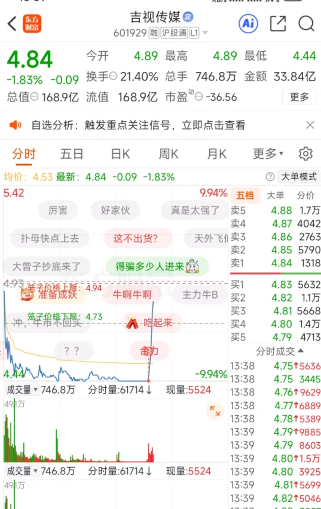 $吉视传媒(SH601929)$ 刺激,体验了一把盘中富贵,再来一次