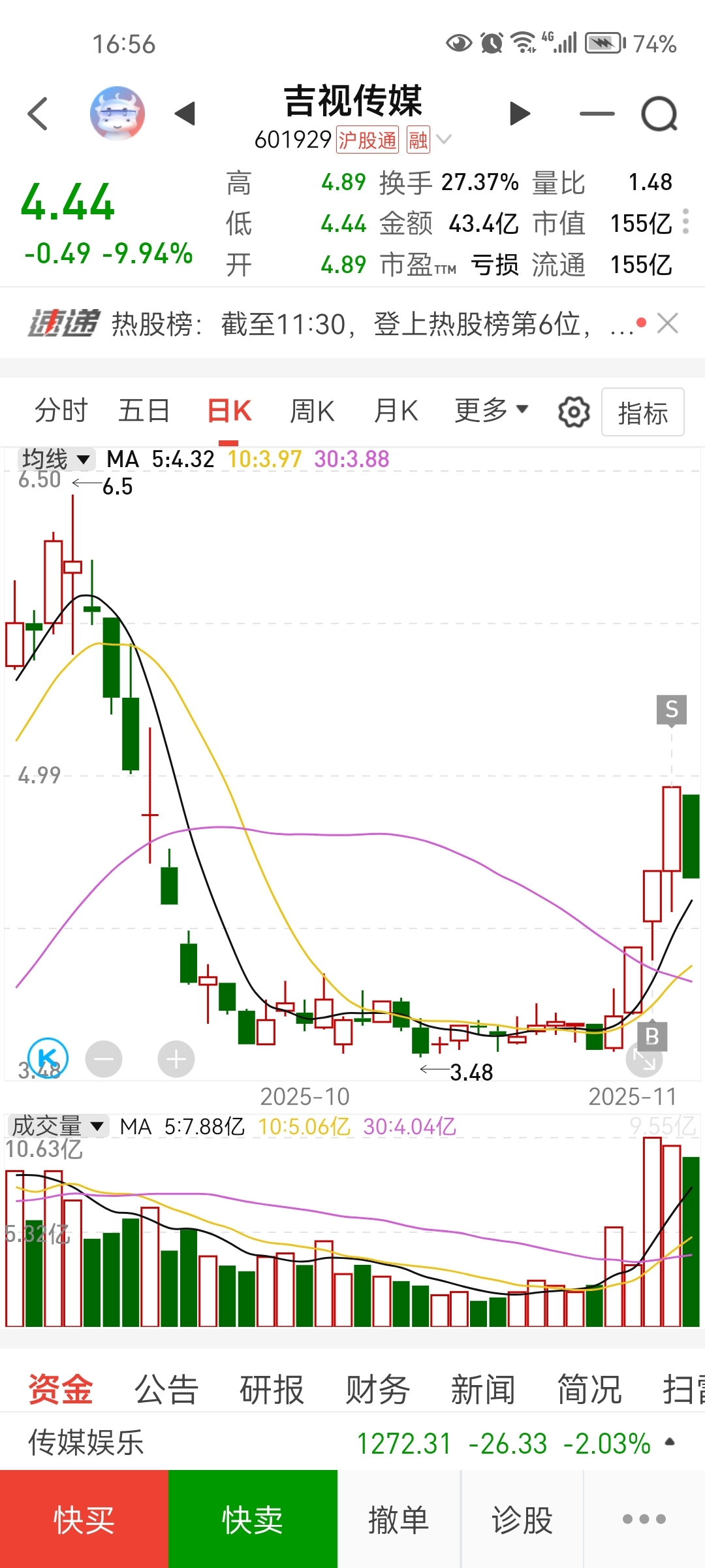 $吉视传媒(SH601929)$ 昨天水上8个点出了,今天水下8个点接回