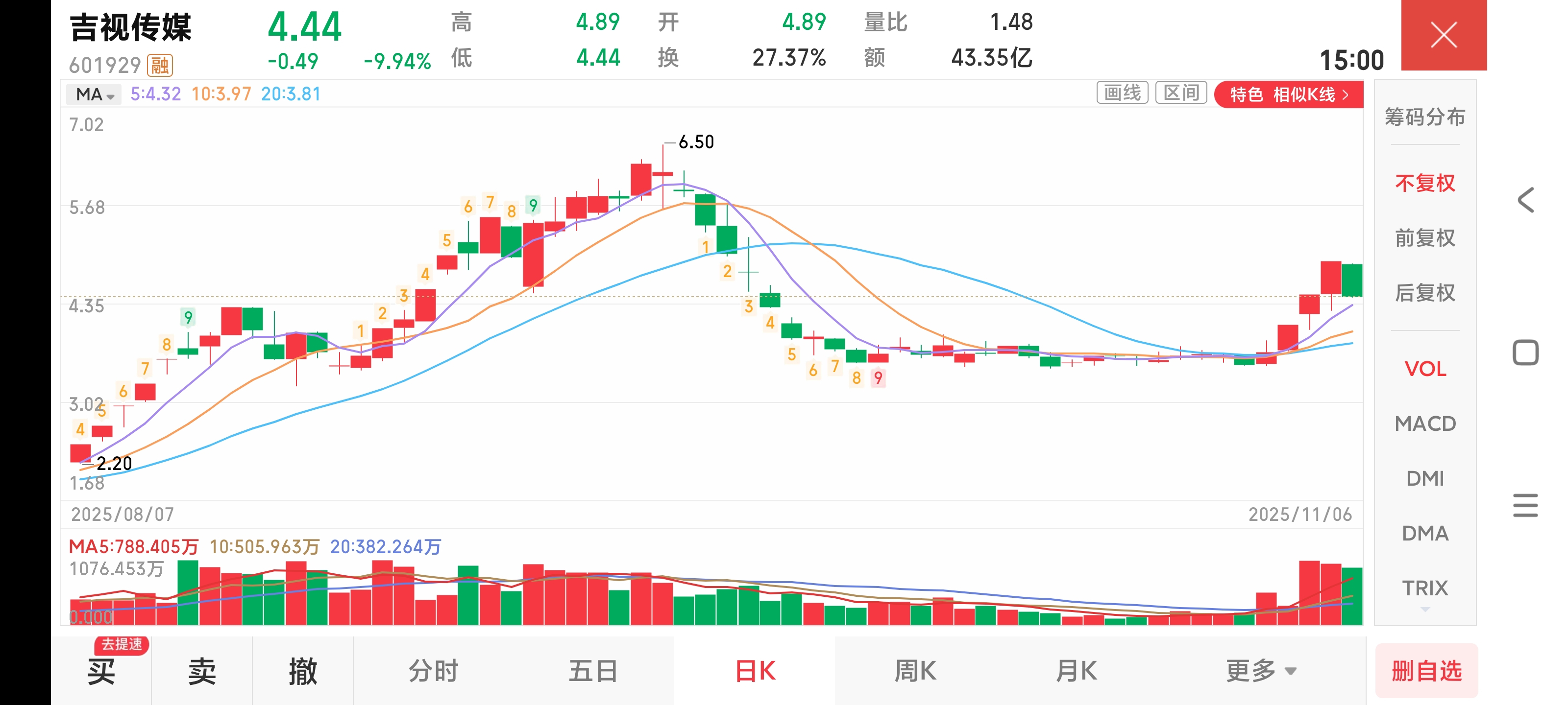 $吉视传媒(SH601929)$ 周一连续三个涨停,就是冲着过前高6.5元去的。如果是超跌反弹,周一涨停后周二冲高就已是反弹的极限了。今天跌停板上全是中小散户单,没有几个超过5千手的主力大卖单。下周至少三个涨停板上去。