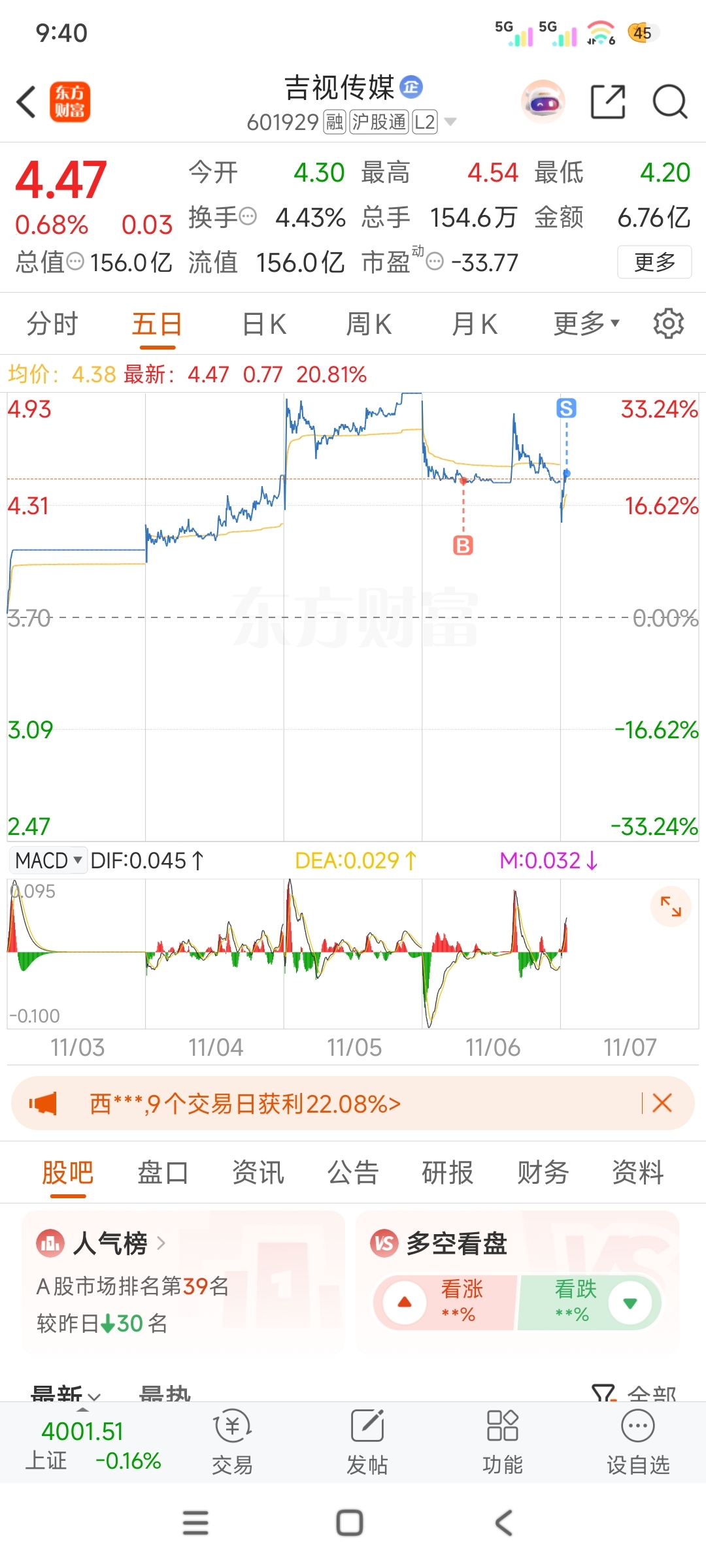 $吉视传媒(SH601929)$ 算了,还是安全第一,4.50跑了,一个点利润落袋