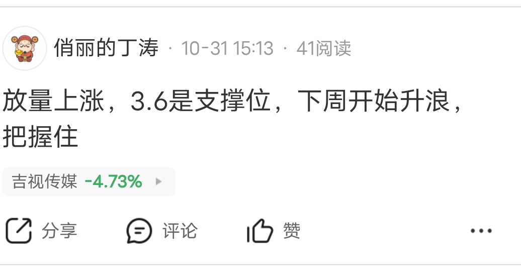 $吉视传媒(SH601929)$ 预判正确,接下来在十日线会有反弹,然后持续下跌,兄弟们自行选择,追高的要不割肉,要不救做t降低成本