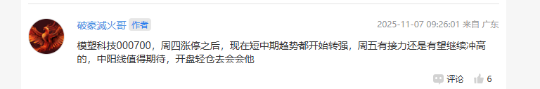 模塑科技000700:上周五虽然受减持的影响没有太亮眼的表现,但是短期来看主要还是受市场情绪影响的概率更大,现在位置又不算太高,下方多条均线也是拐头向上的,上周五虽然出现了调整,但是短期来看是良性的调整,对他依然还是比较有信心的,周一回踩五日线之后如果能有较好的接力,还是有望反包的。