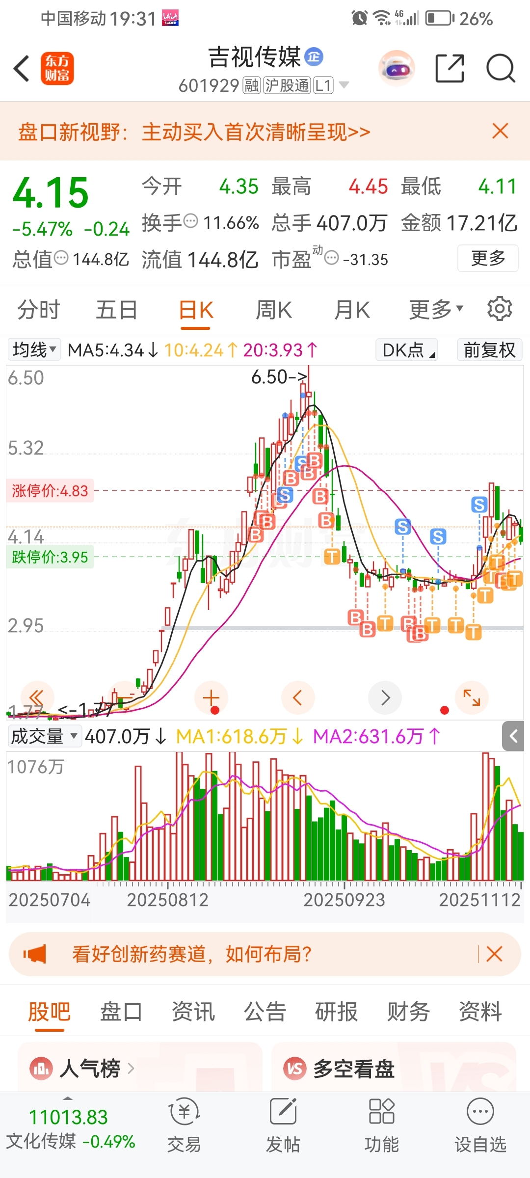 $吉视传媒(SH601929)$ 太大意了又满仓干了进去,我还以为不会重复历史走势,结果还是跟9.18号走势一模一样,前两天开始诱多给散户遐想空间和信心,结果一天比一天跌的厉害,上次直接腰斩才企稳,现在又奔着这个方向去?我悟了,散户怎么都玩不过庄家,只能严格遵守止损条件,不看当日走势,触发机制无条件走人