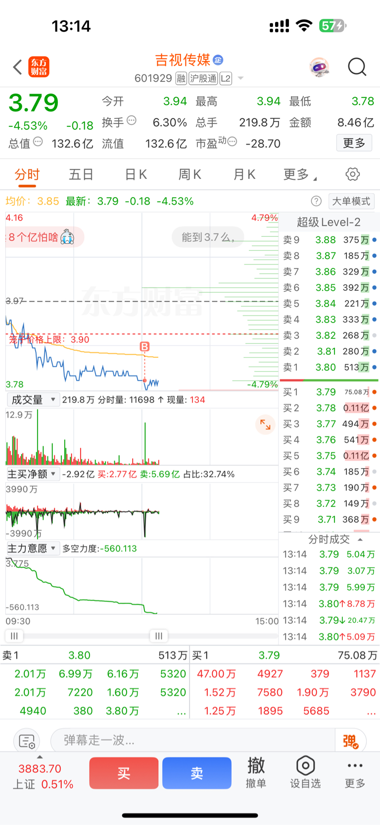 $吉视传媒(SH601929)$ 3.80单一下被秒,买进有点后悔了