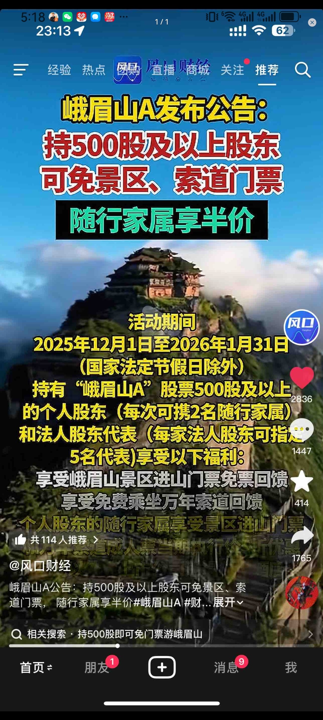 $吉视传媒(SH601929)$ 看看别人峨眉山500股免门票直觉封盘。瞧瞧别人咋对股东回馈,咋对股票回报。