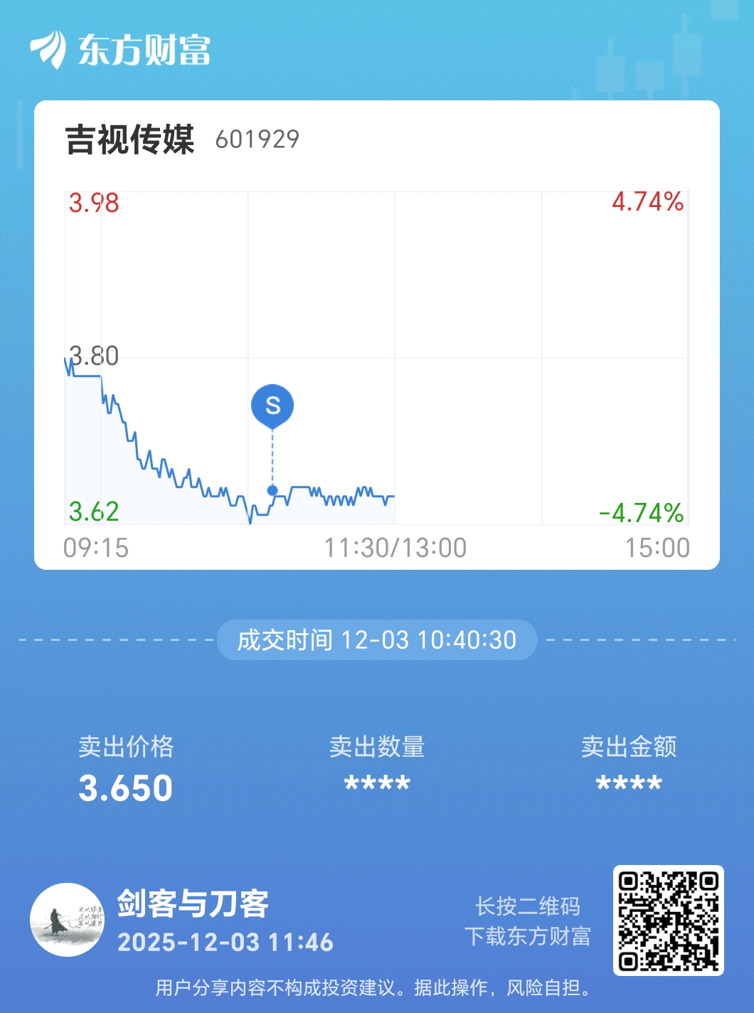 $吉视传媒(SH601929)$ 买了一个月,一直阴跌,跌了十几个点,实在扛不住了,今天割了,再也不碰,真的想说脏话,但脏话说不出来,哎#炒股日记#