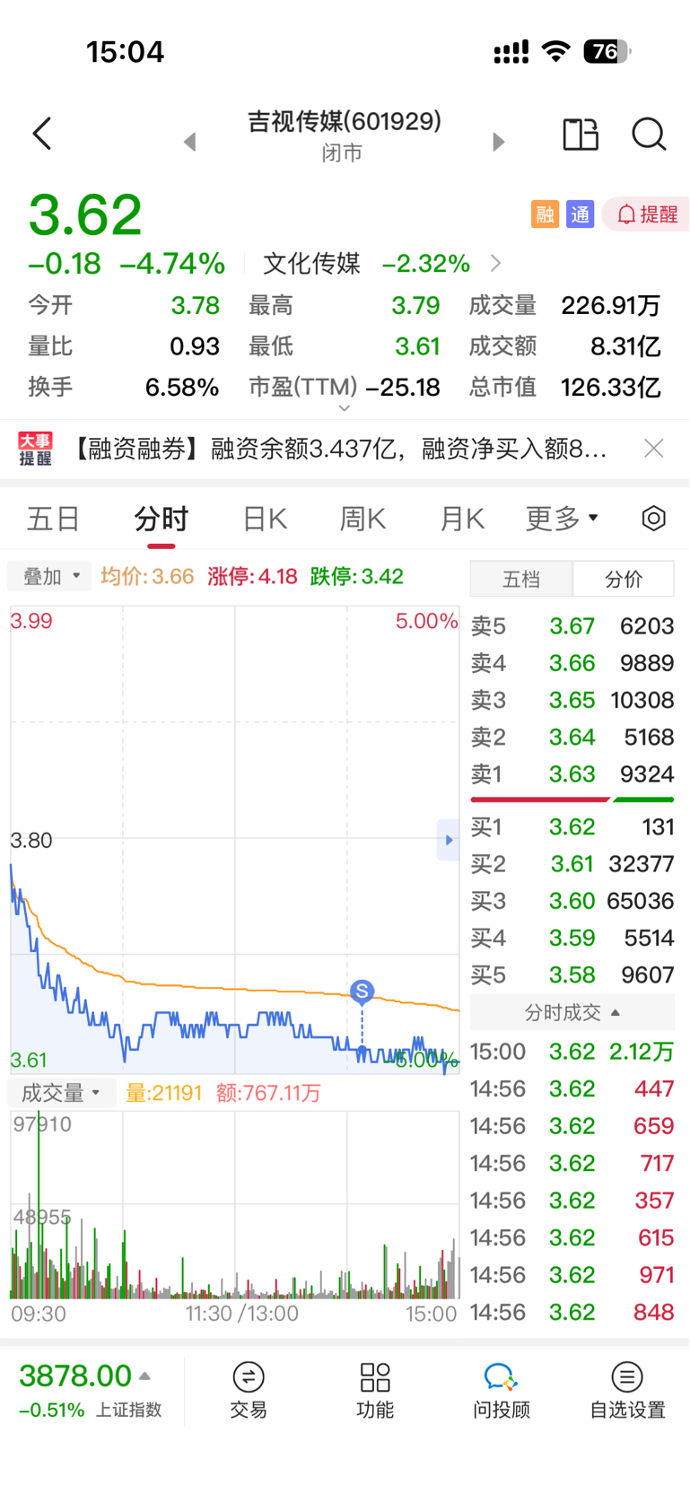 $吉视传媒(SH601929)$ 割肉了嘛的,亏3000多