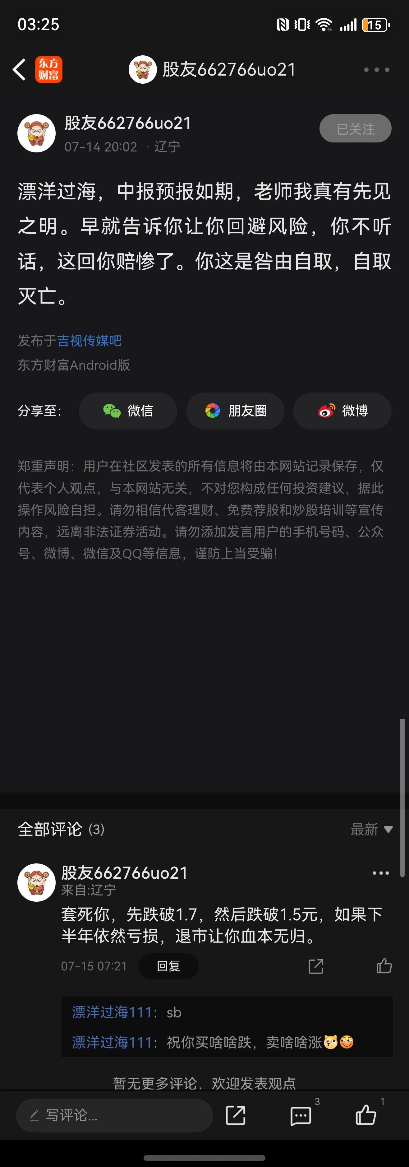 温馨提示: 1.根据《证券法》规定,禁止编造、传播虚假信息或者误导性信息,扰乱证券市场;2.用户在本社区发表的所有资料、言论等仅代表个人观点,与本网站立场无关,不对您构成任何投资建议。用户应基于自己的独立判断,自行决定证券投资并承担相应风险。《东方财富社区管理规定》