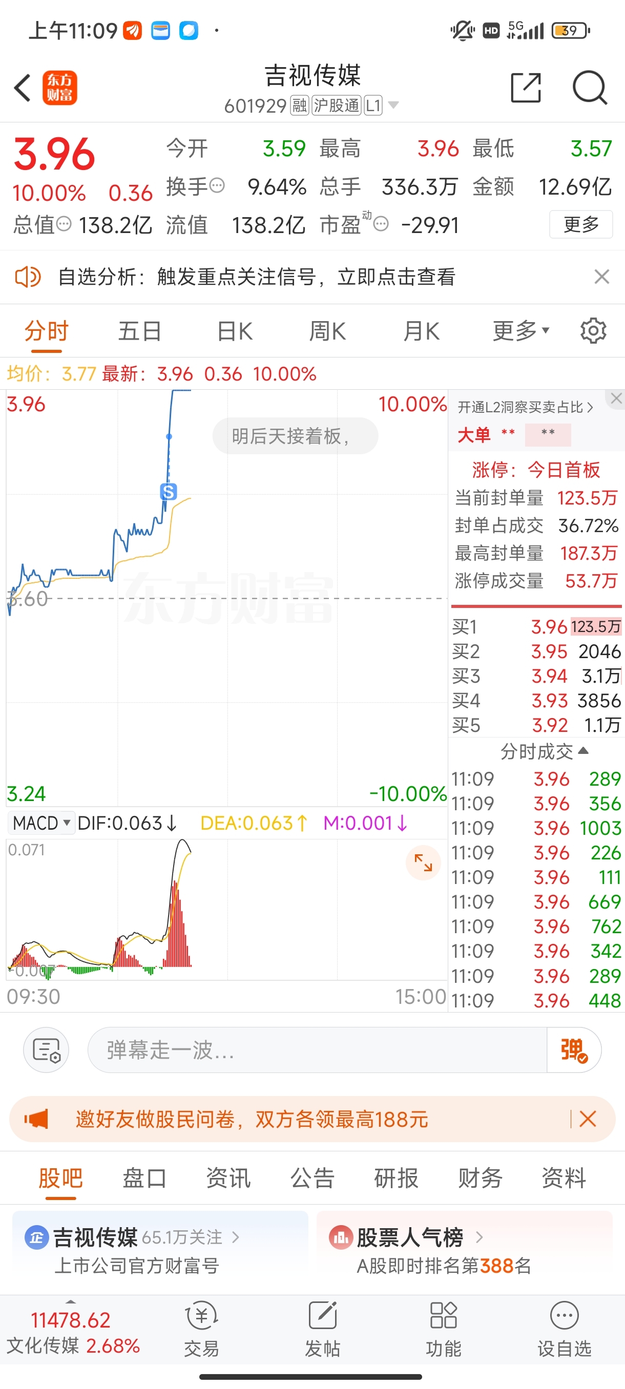 $吉视传媒(SH601929)$ 4.93的本,3.85我卖了一半我晕了