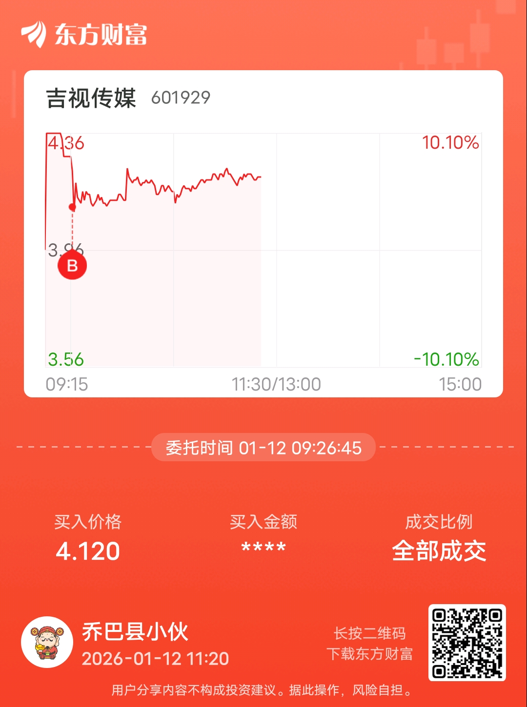 温馨提示: 1.根据《证券法》规定,禁止编造、传播虚假信息或者误导性信息,扰乱证券市场;2.用户在本社区发表的所有资料、言论等仅代表个人观点,与本网站立场无关,不对您构成任何投资建议。用户应基于自己的独立判断,自行决定证券投资并承担相应风险。《东方财富社区管理规定》