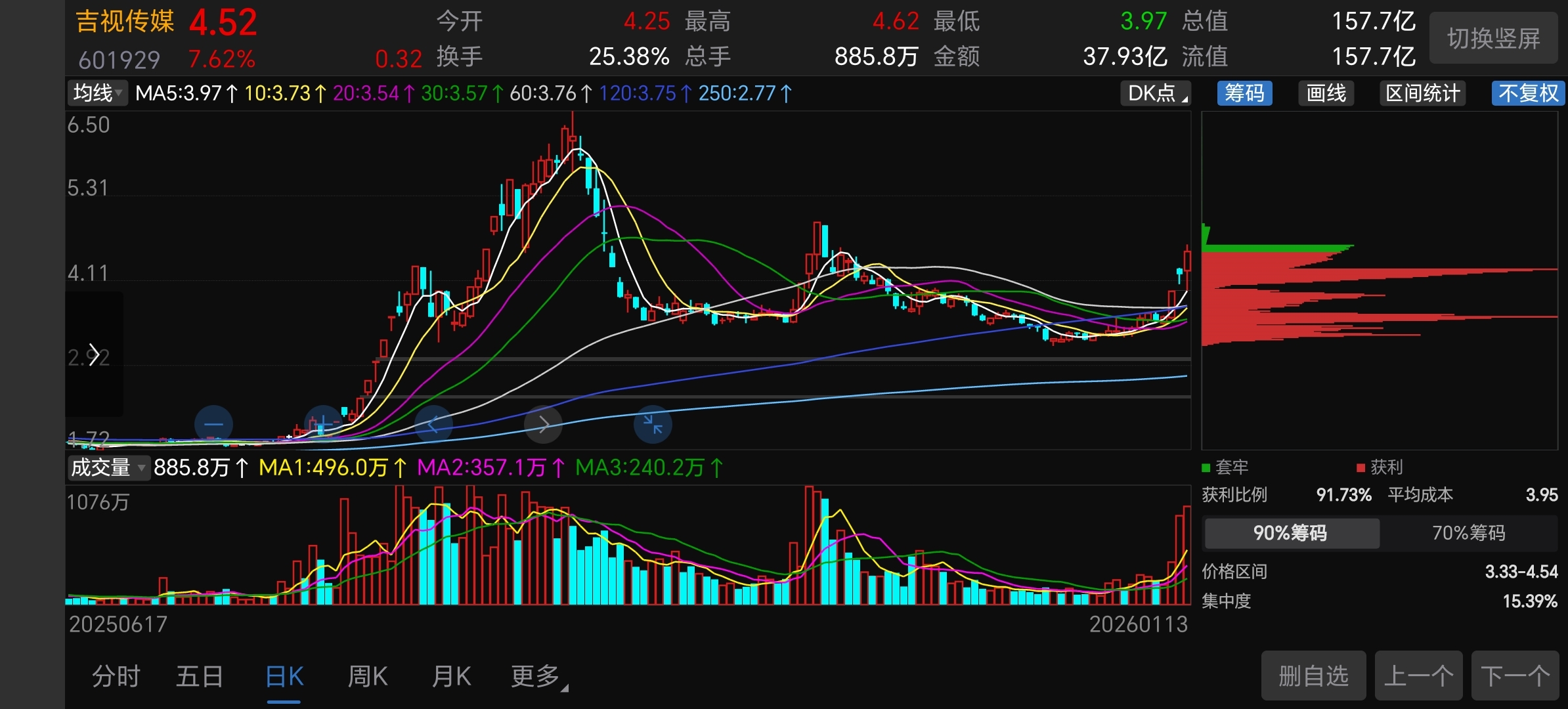 $吉视传媒(SH601929)$ 看筹码分布,明天想不涨都难