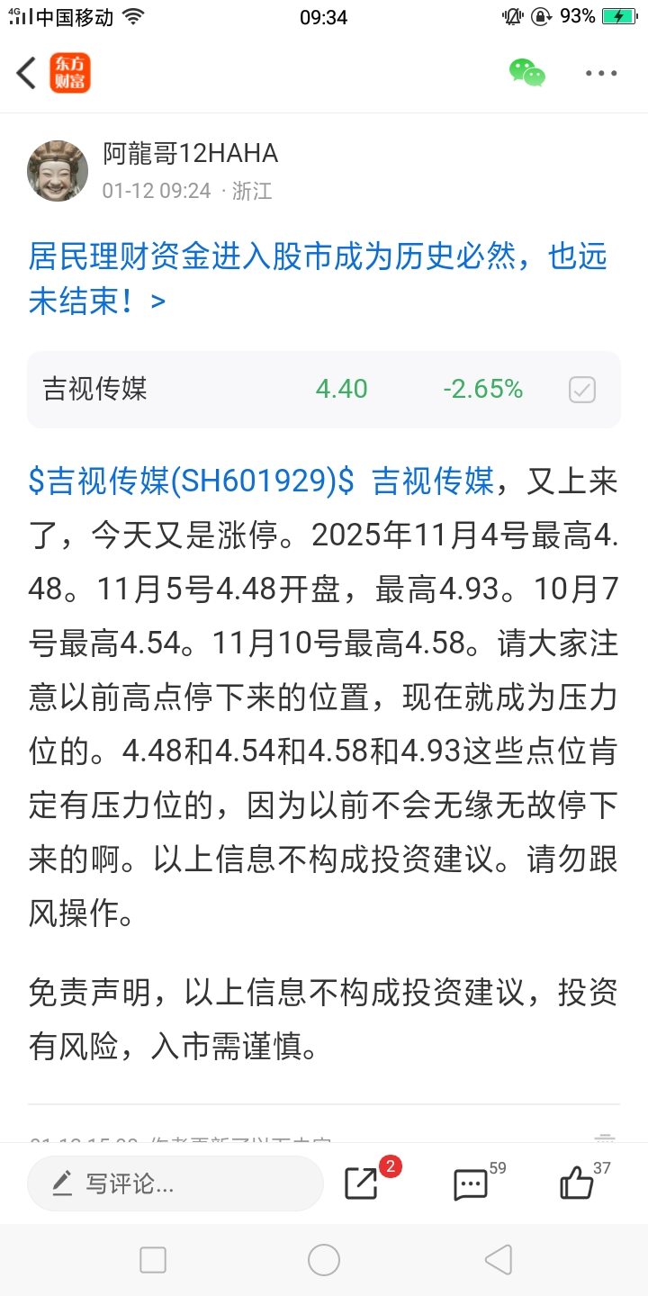 吉视传媒,有人来嘲讽了。说我是踏空了。真的无语,我的单子继续在里面潜伏。我是赚的盆满钵满,我走的时候会发出帖子的。最起码上方4.93要让他去冲一下,这是2025年10月份的高点。我是不急的,因为我大幅度盈利了,我等得起,大不了盈利被回退一些,我胃口很大,我盈利起码要翻几番,才可以慢慢撤退。以上信息不构成投资建议,请勿跟风操作。
