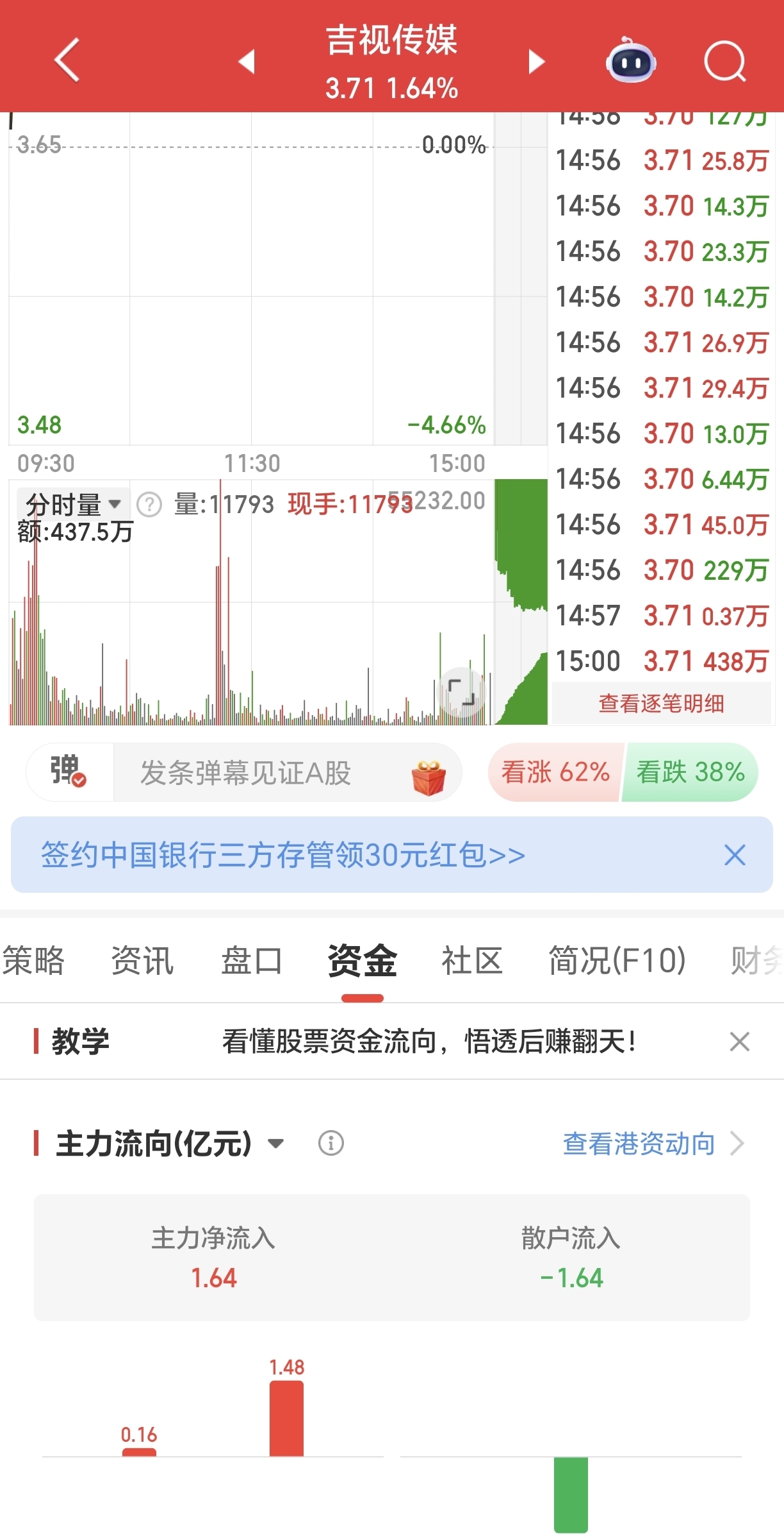 $吉视传媒(SH601929)$ 1.64亿涨1.64个点,这是故意的吧