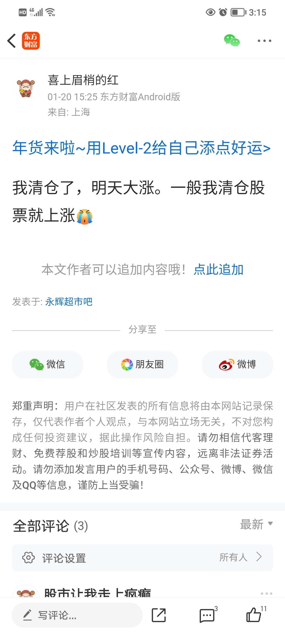 温馨提示: 1.根据《证券法》规定,禁止编造、传播虚假信息或者误导性信息,扰乱证券市场;2.用户在本社区发表的所有资料、言论等仅代表个人观点,与本网站立场无关,不对您构成任何投资建议。用户应基于自己的独立判断,自行决定证券投资并承担相应风险。《东方财富社区管理规定》
