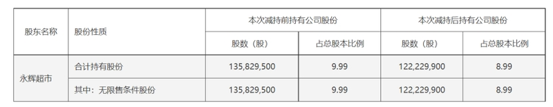 公告显示,永辉超市于2025年8月29日至2025年10月16日,通过集中竞价方式减持红旗连锁股份1359.96万股,占红旗连锁总股本的1%;本次减持的减持均价为5.96元/股,经计算,永辉超市因此套现约8105.36万元。