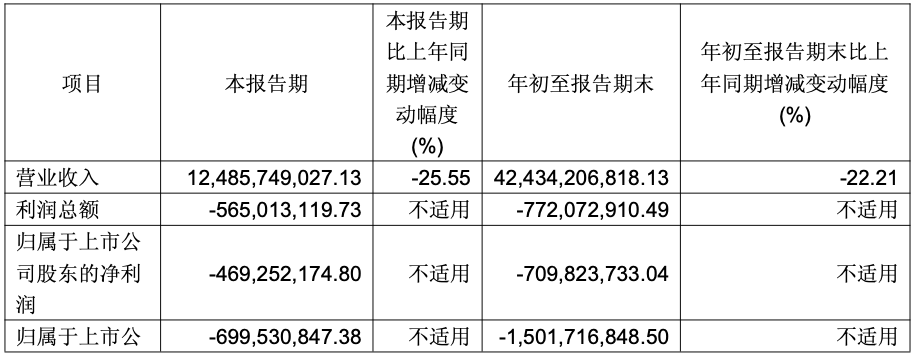 其中,第三季度公司营业收入124.86亿元,同比下降25.55%;归母净利润-4.69亿元,扣非后归母净利润-7亿元。