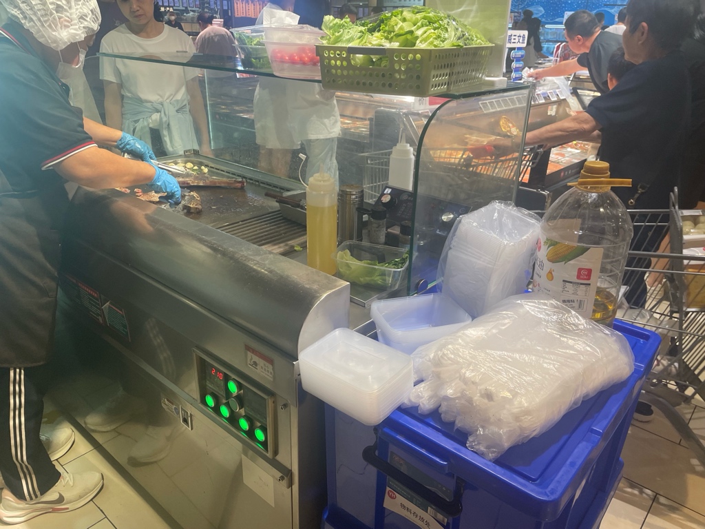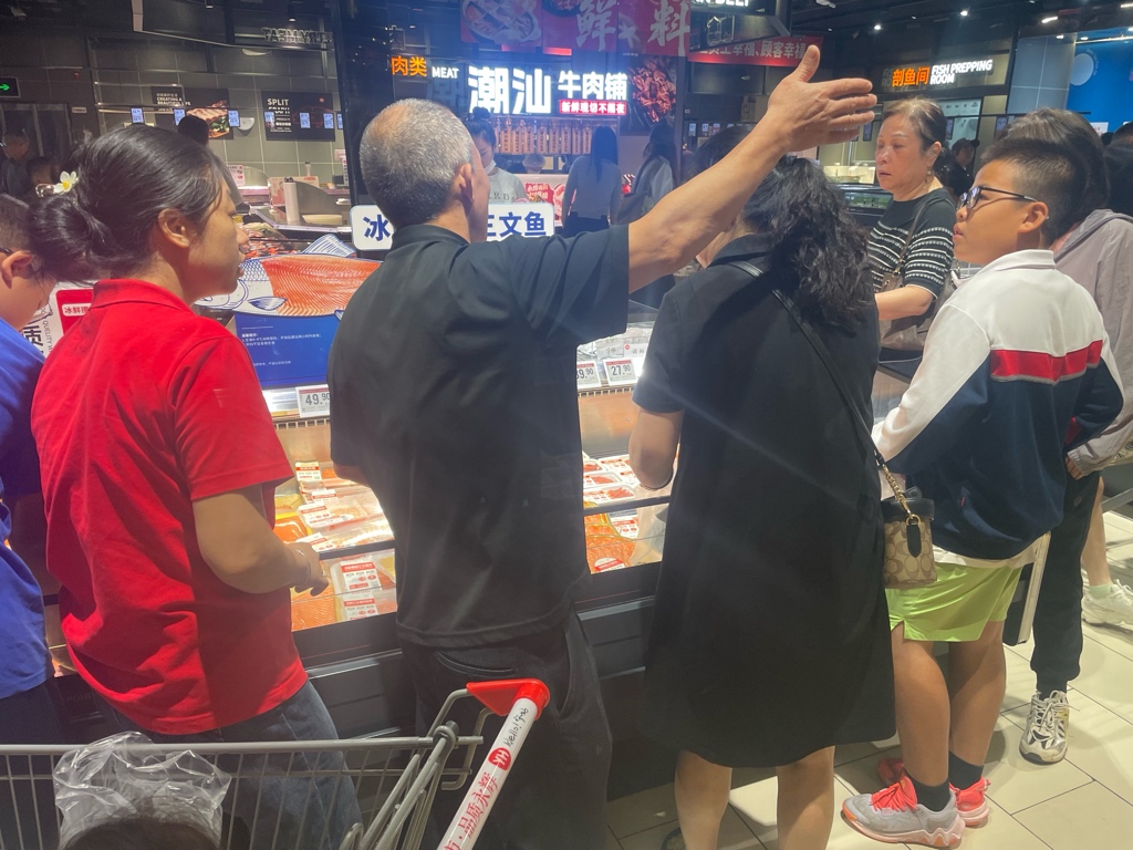 三文鱼摊位好多人在选购,后面是潮汕牛肉火锅专区。