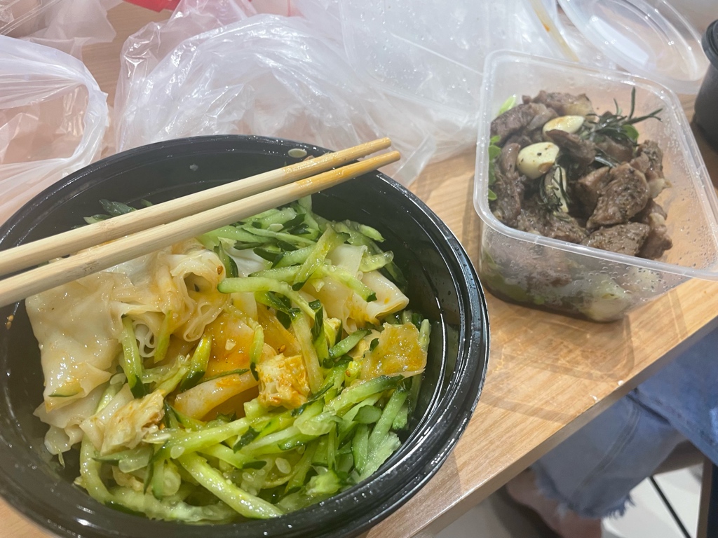 在永辉超市餐饮区吃了凉皮和牛排,又去休息区蹭了免费的茶水,今天逛街任务结束,吃饱喝足回家去