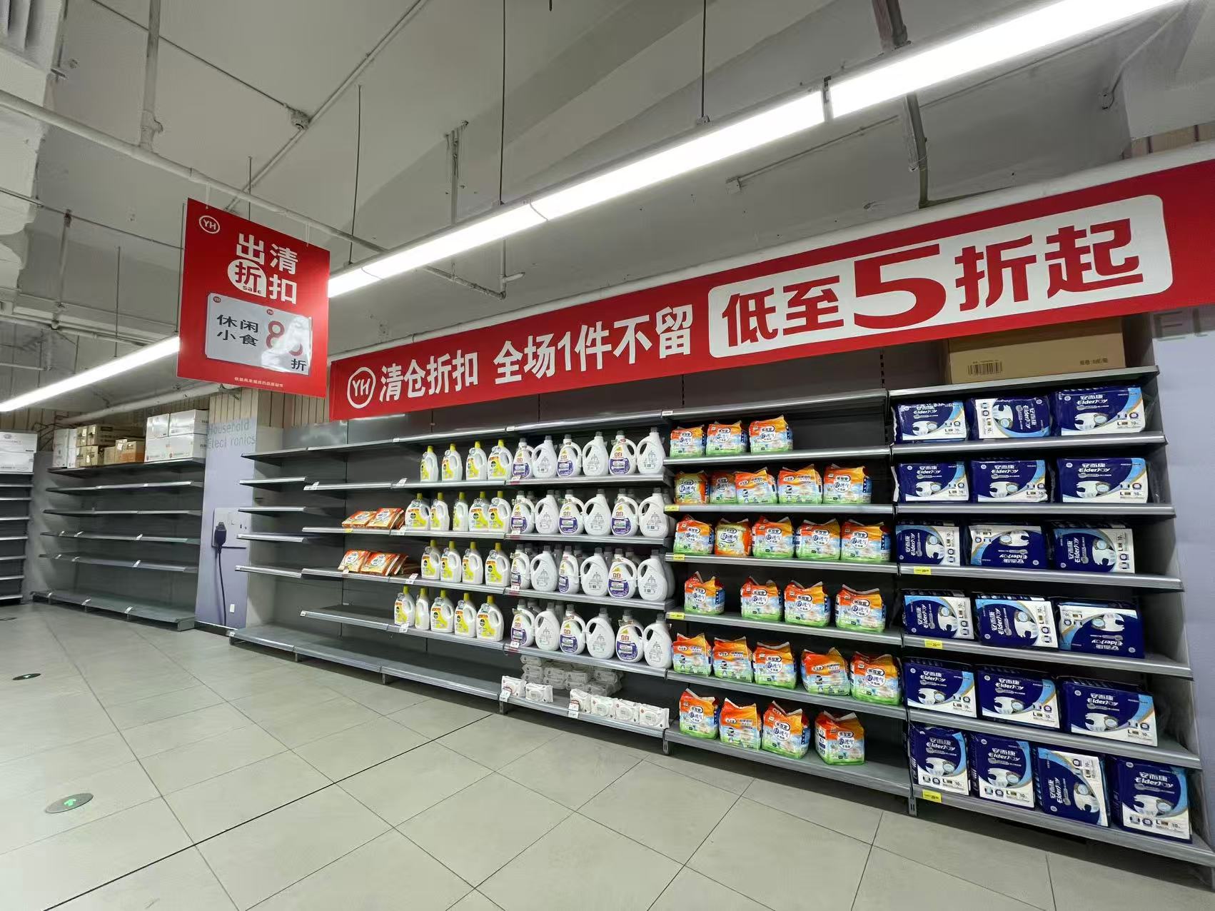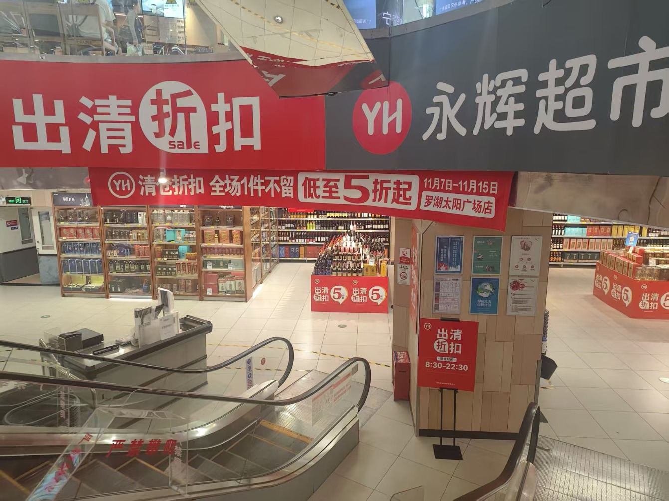 近日,位于深圳核心商圈的永辉超市罗湖太阳广场店、南山来福士广场店正式公告,两店将于11月16日正式停止营业。11月3日,深圳商报·读创客户端记者来到位于东门老街的永辉超市罗湖太阳广场店,看到“清仓折扣,全场1件不留”“出清折扣,低至5折起”等条幅随处可见,货架已有一半清空,不少顾客推着购物车挑选剩余商品。