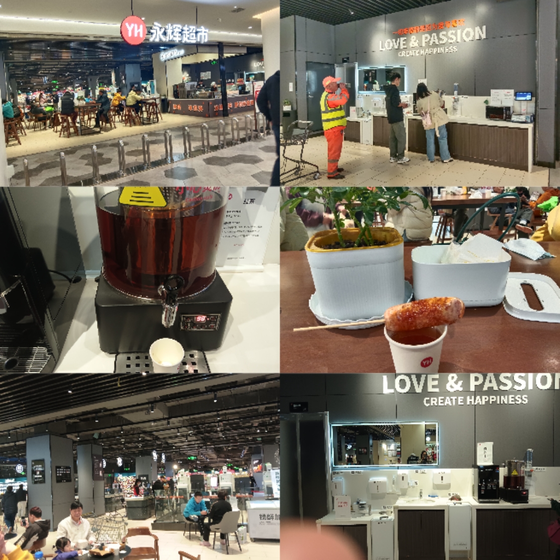 $永辉超市(SH601933)$ 永辉超市挺好的,这个茶吧弄的非常人性化,隔三差五来蹭免费的茶水喝,然后被店员小姐姐一路投喂各种卤菜和免费试吃小零食,中午一分钱没花吃饱喝足,美的很!出了永辉我又胖了三斤,