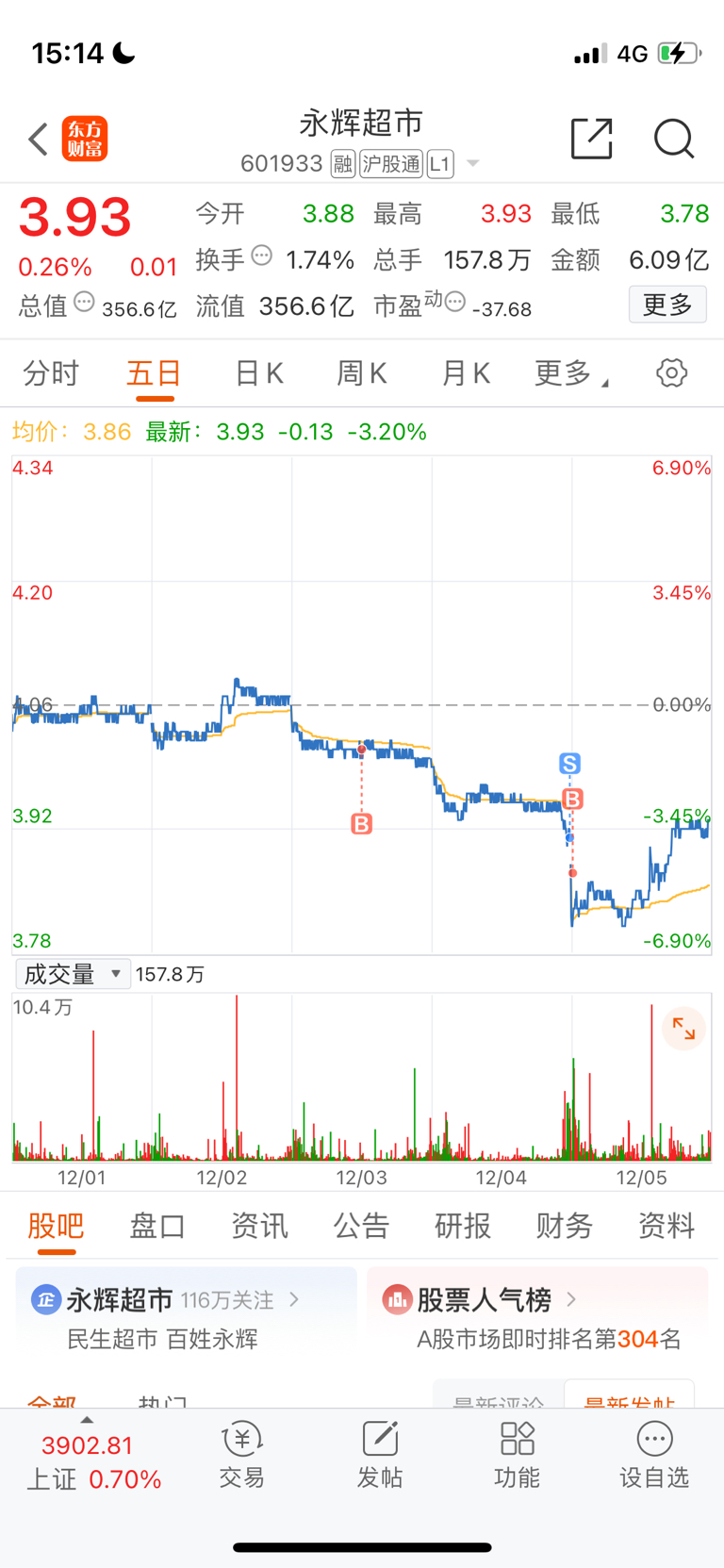 $永辉超市(SH601933)$ 做了一个非常窝囊的T,早盘竞价还以为跌停了结果撤单了