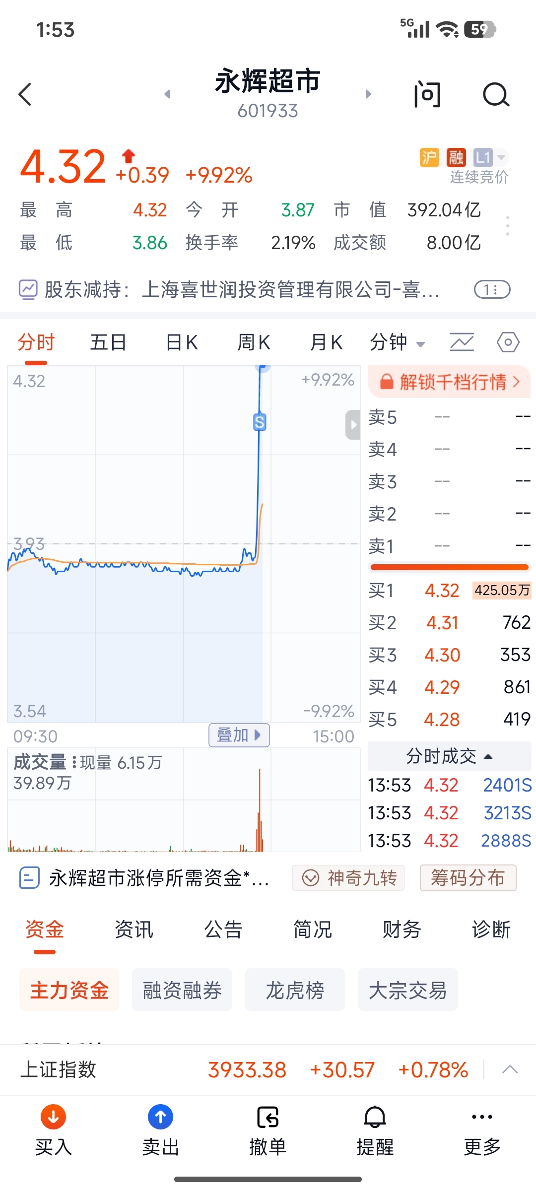 $永辉超市(SH601933)$ 封板不坚决 先走一部分