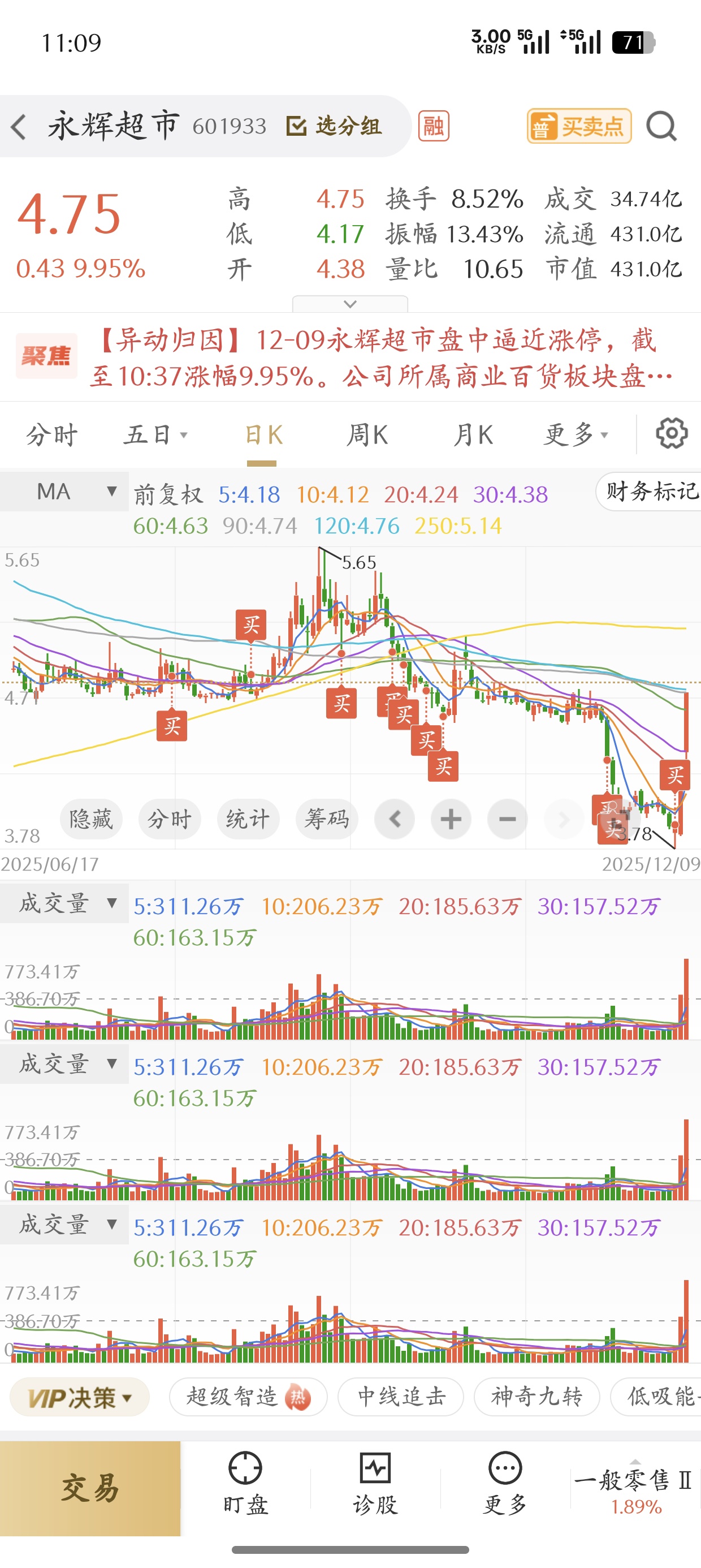$永辉超市(SH601933)$ 掐指一算,闭目养神得出结果,今天等会又是一只穿云箭,涨停板收盘,别问我为什么,有天大的事情发生在永辉超市,具体什么事自有公告出来,今天是难得的倒车接人,现在不抓住回调机会买入,十二月份你会判断两条大腿,拭目以待,收盘见分晓!