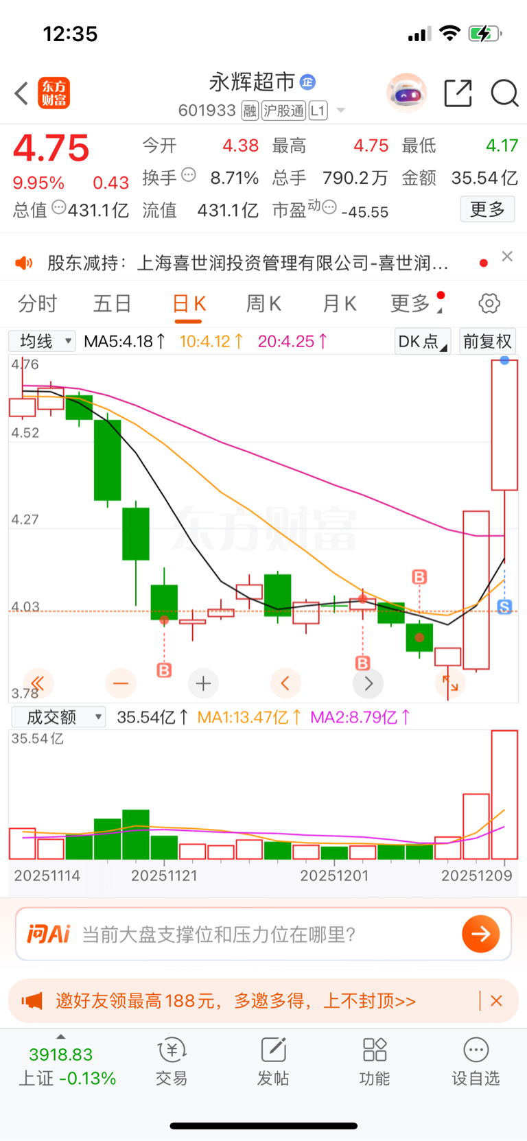 $永辉超市(SH601933)$ 刚进的票,本来想拿长期的,被30万手卖单吓坏了,出了一点点,继续持有等业绩反转!中国本土的大型超市就看永辉了!