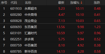 上证报中国证券网讯 12月10日早盘,零售板块领涨,截至9时31分,永辉超市3连板,东百集团4连板,中央商场、茂业商业2连板,步步高、汇嘉时代涨停,中百集团、新华百货等跟涨。