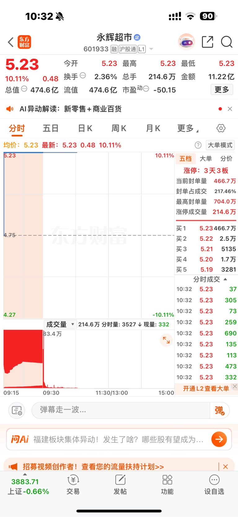 $永辉超市(SH601933)$ 700 万封单,无能能撼动,喜提二连