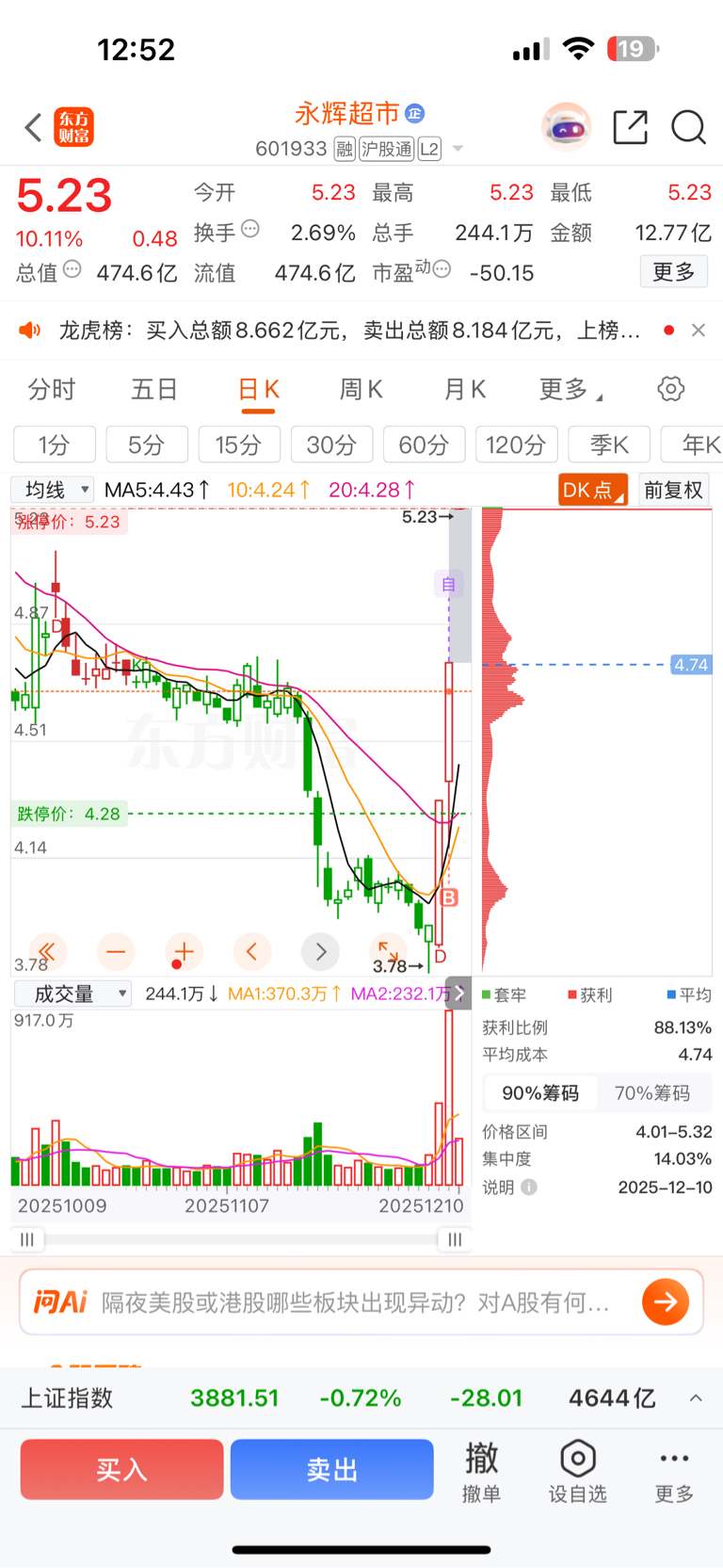 $永辉超市(SH601933)$ 昨天没多余仓位才进了20%不到,想等等卖掉再进 没想到封板那么快