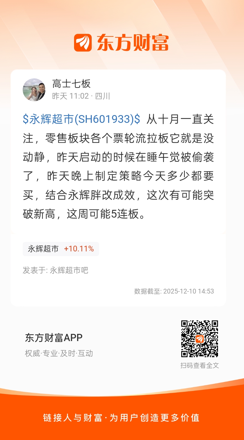 $永辉超市(SH601933)$ 从十月一直关注,零售板块各个票轮流拉板它就是没动静,昨天启动的时候在睡午觉被偷袭了,昨天晚上制定策略今天多少都要买,结合永辉胖改成效,这次有可能突破新高,这周可能5连板。