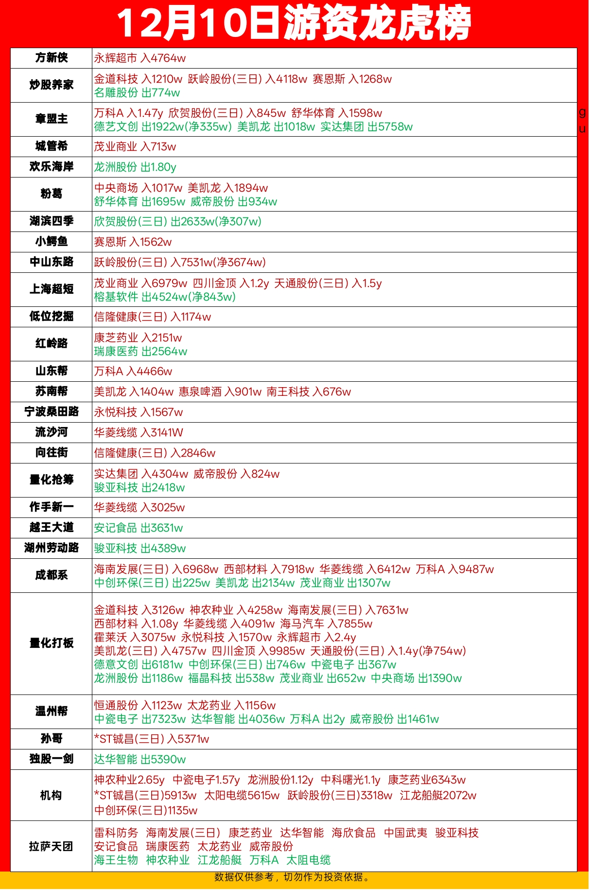 12.10游资龙虎榜,方新侠章盟主炒股养家上榜。