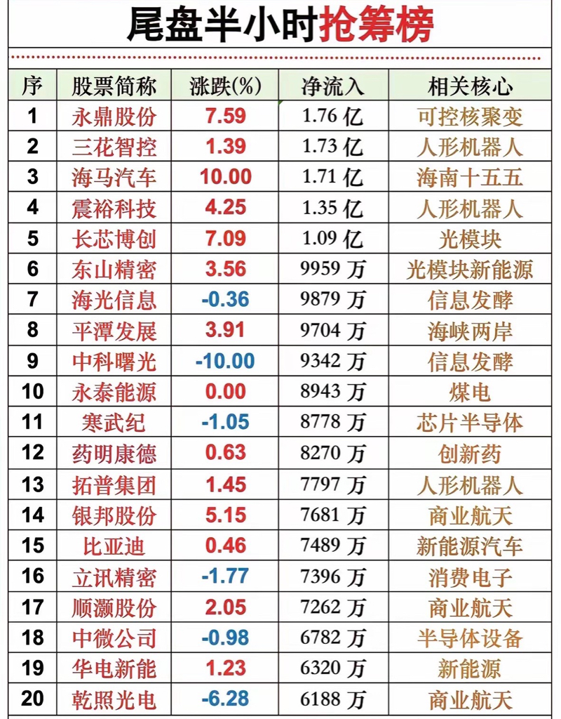 12月10日尾盘最后半小时,可控核聚变、人形机器人、光模块及新能源汽车方向获资金