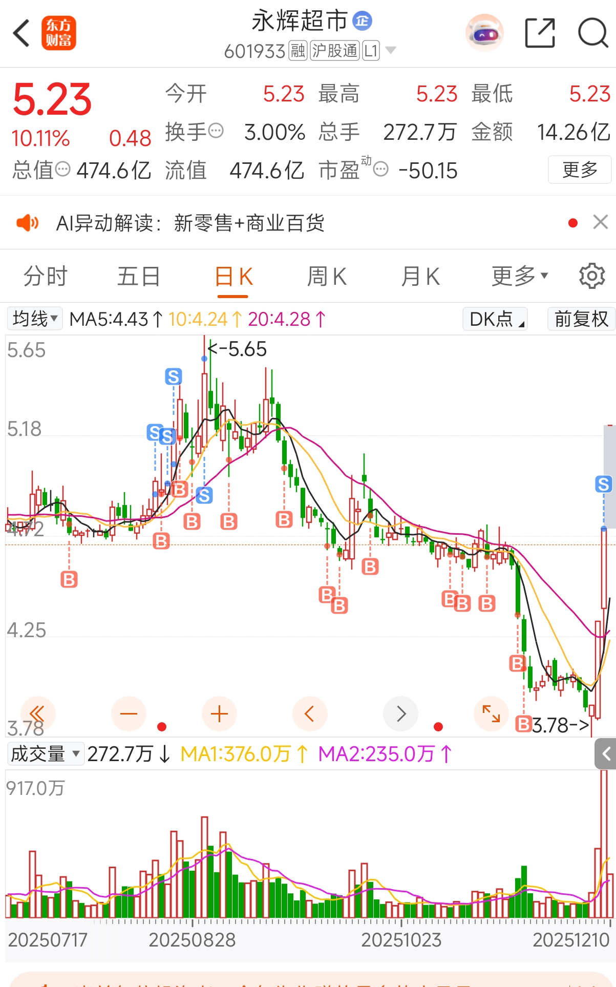 $永辉超市(SH601933)$ 今天缩量涨停,说明散户都被洗完了,哎,早知道昨天不卖了,至少还有2个板