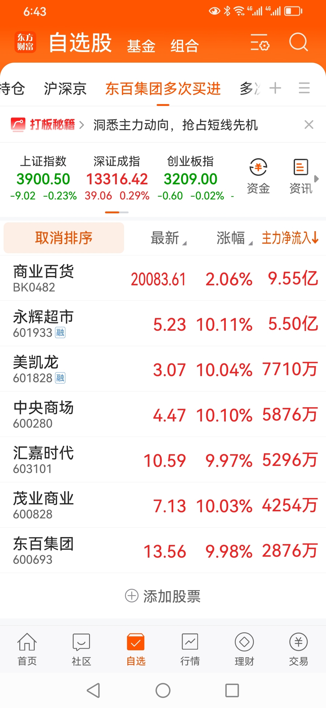 方军:自选股 商业百货股票 多次买进 多日买进 东百集团 永辉超市 中百集团