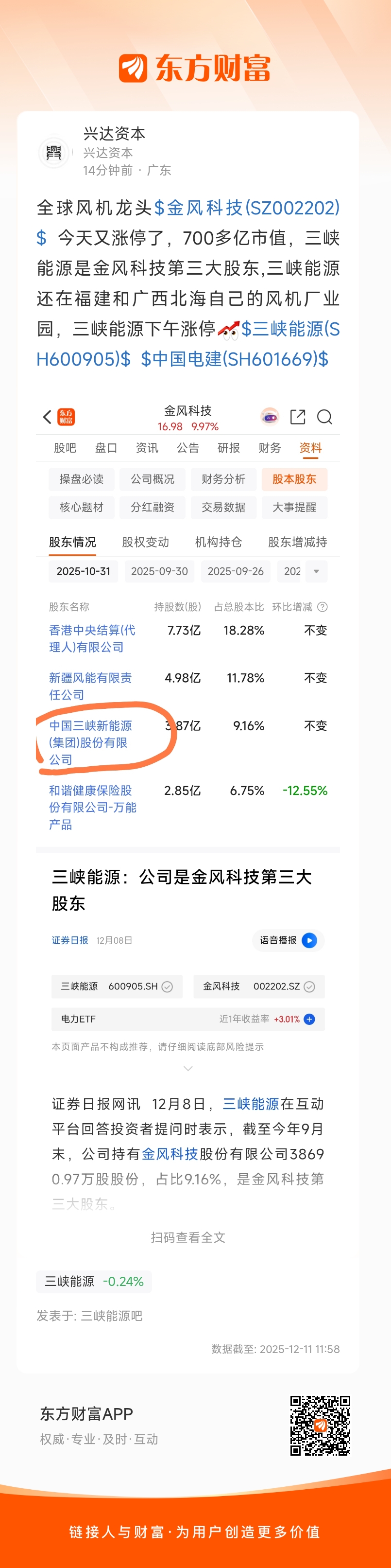 全球风机龙头$金风科技(SZ002202)$  今天又涨停了,700多亿市值,三峡能源是金风科技第三大股东,三峡能源还在福建和广西北海自己的风机厂业园,三峡能源下午涨停$三峡能源(SH600905)$  $中国电建(SH601669)$