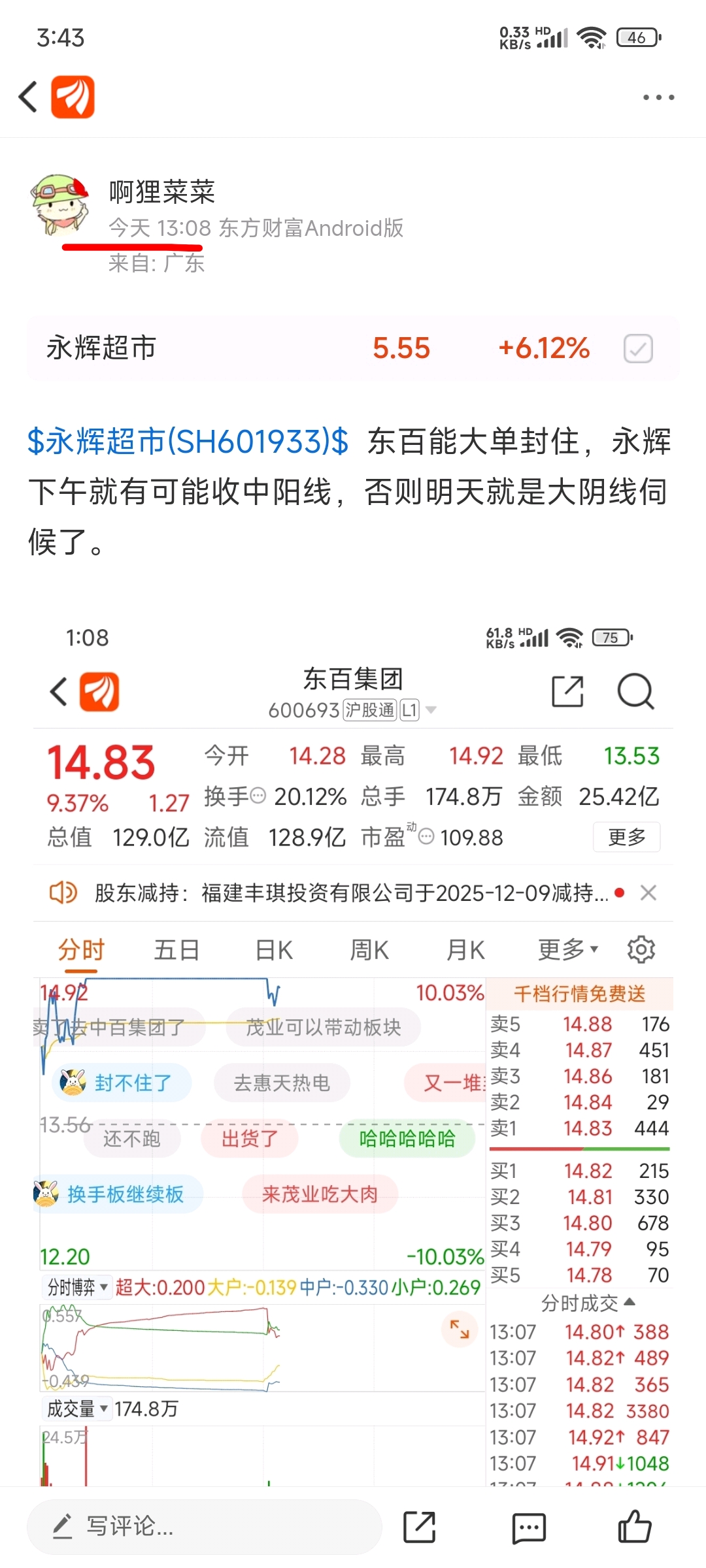 $永辉超市(SH601933)$ 下午开盘永辉绿两个多点给出的观点,今天释放获利盘和套牢盘,有资金承接筹码,明天看$东百集团(SH600693)$ 还有没有戏,永辉的行情还没有结束,目前继续持有。$富瑞特装(SZ300228)$ 富瑞今天这个量能很漂亮,继续向上释放套牢盘,继续洗盘,主力还在吸筹,等主升浪的连板行情。
