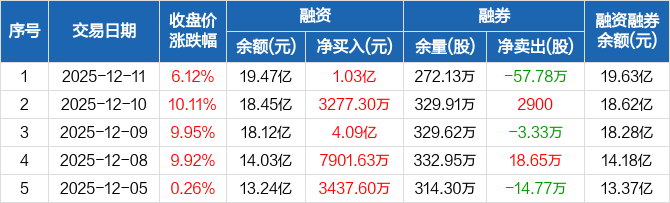 融资方面,当日融资买入9.65亿元,融资偿还8.62亿元,融资净买入1.03亿元,净买入额两市排名第13,连续5日净买入累计6.57亿元。融券方面,融券卖出4.06万股,融券偿还61.84万股,融券余量272.13万股,融券余额1510.32万元。融资融券余额合计19.63亿元。