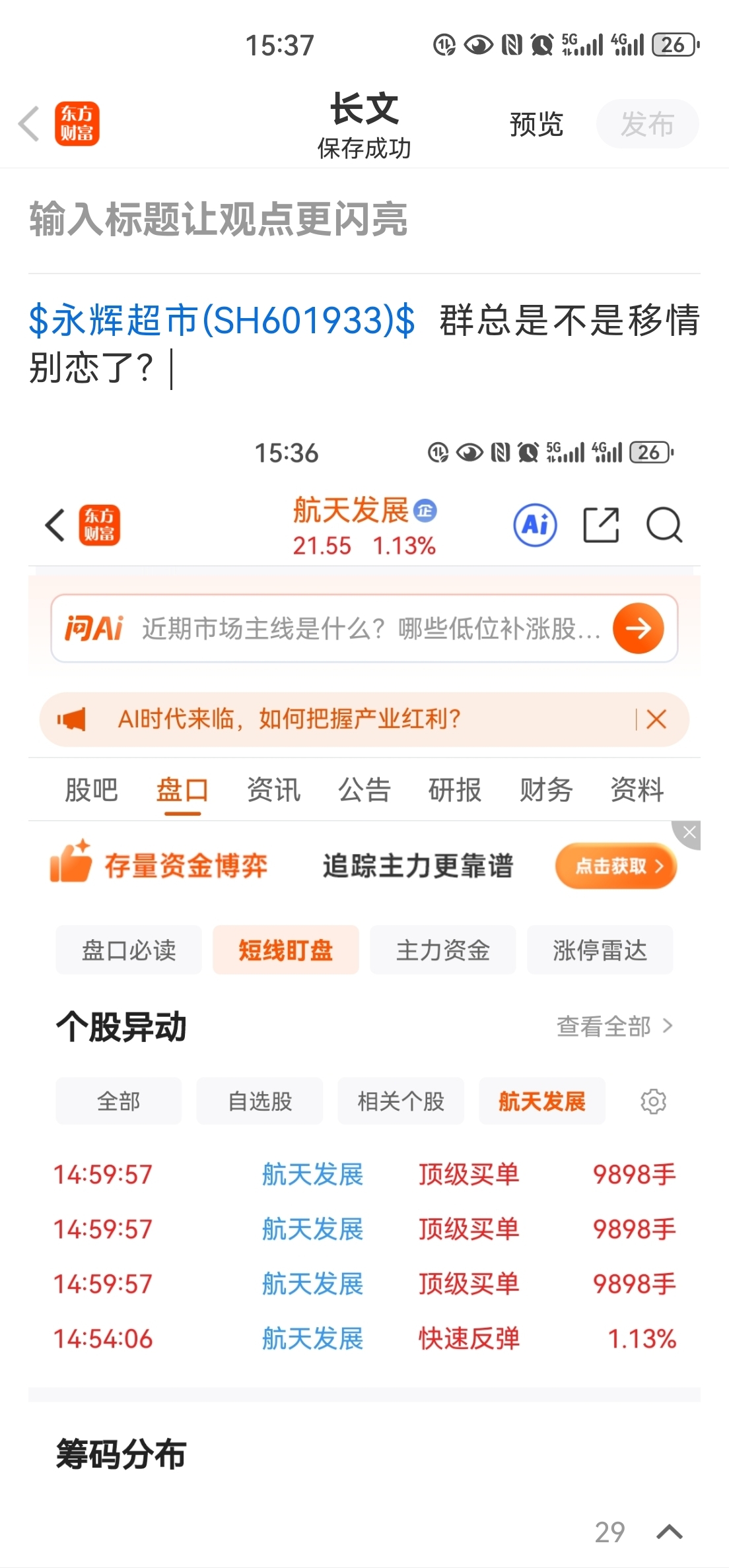 $永辉超市(SH601933)$ 航天发展尾盘出现那么多9898,是不是群总跑商业航天了?