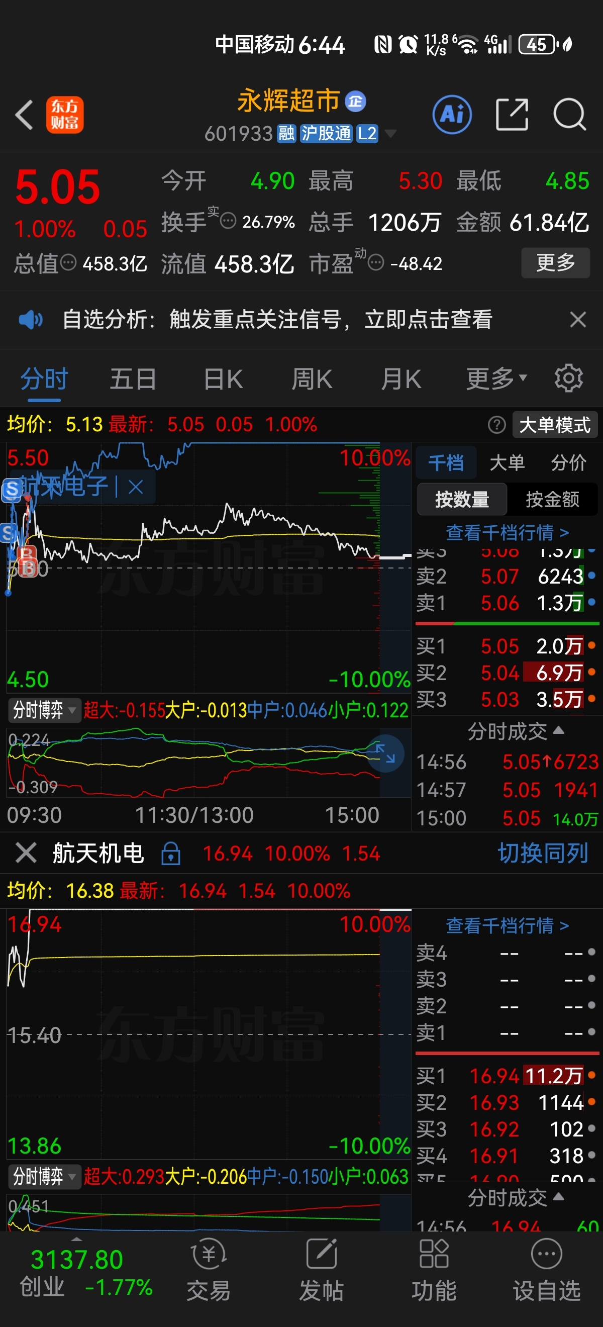 今天割了永辉超市去买航天机电,航天电子。以后再也不看你