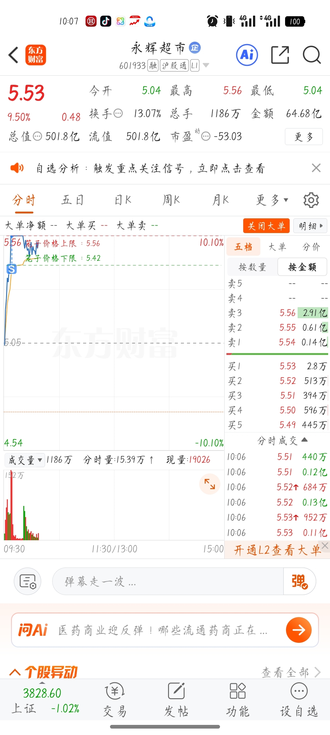 $永辉超市(SH601933)$ 封板三个亿直接被吃了